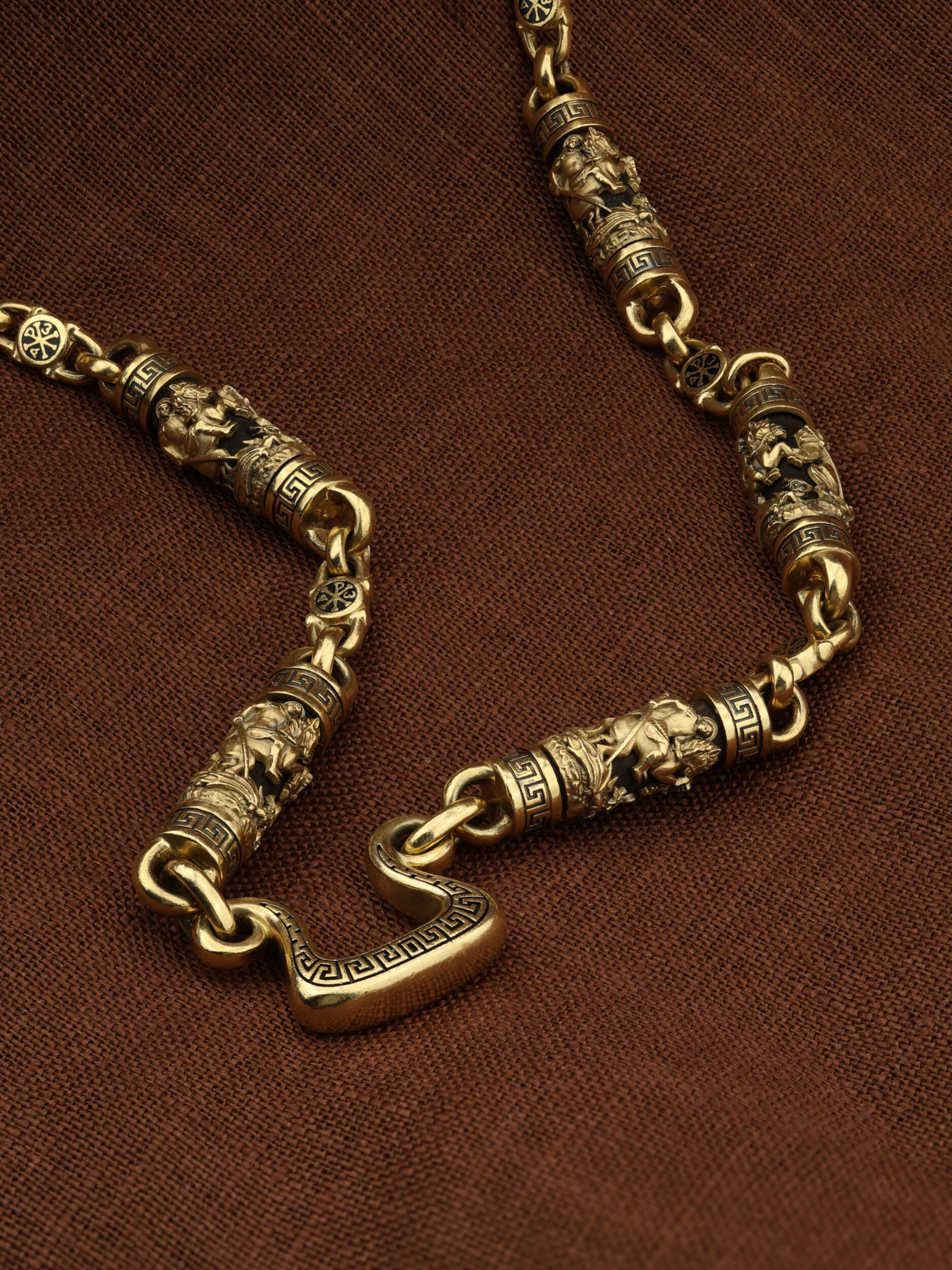 На звеньях цепи изображена Хризма — монограмма имени Христа, которая состоит из двух начальных греческих букв имени — Х (хи) и Р (ро), скрещённых между собой. По краям монограммы помещены греческие буквы a и w. Такое употребление этих букв восходит к тексту Апокалипсиса: «Аз есмь Альфа и Омега, начало и конец, говорит Господь, Который есть и был и грядет, Вседержитель.» (Откр. 1:8; см. также Откр. 22:13). Также на звеньях цепи помещено изображен святого великомученика Георгия Победоносца — одного из самых почитаемых и удивительных святых. Георгий родился в Каппадокии (Малая Азия) в семье богатых и знатных горожан. Юношей поступил на службу к римскому императору Диоклетиану, за отличное знание военного дела и проявленную в боях и походах храбрость был приближен к императору и удостоен высокого воинского звания. Во время начавшихся гонений на христиан, перешел на сторону гонимых и, отвергнув человеческий страх, стал ярым проповедником учения Христа. Мучители подвергли опального воеводу жесточайшим восьмидневным пыткам и казнили его (обезглавили) в возрасте около тридцати лет в 303 году. На Руси он известен как Юрий или Егорий, заступник для верующих, чья жизнь имеет какое-либо отношение к военным делам, помощник в крестьянском труде. На цепи Георгий изображен как воитель, сидящий на вздыбленном коне и поражающий копьем огнедышащего змея. Змей символизирует собою сатанинские силы. Молитвами вознесенными к Всевышнему и своей непреклонной верой он смог одолеть чудовище. Святой убил змея, спас царскую дочь, принесенную в жертву, и жителей города, их души от влияния дьявола, породив в них надежду и веру в Господа, призывая людей принять христианскую веру. Цепь украшена орнаментом.