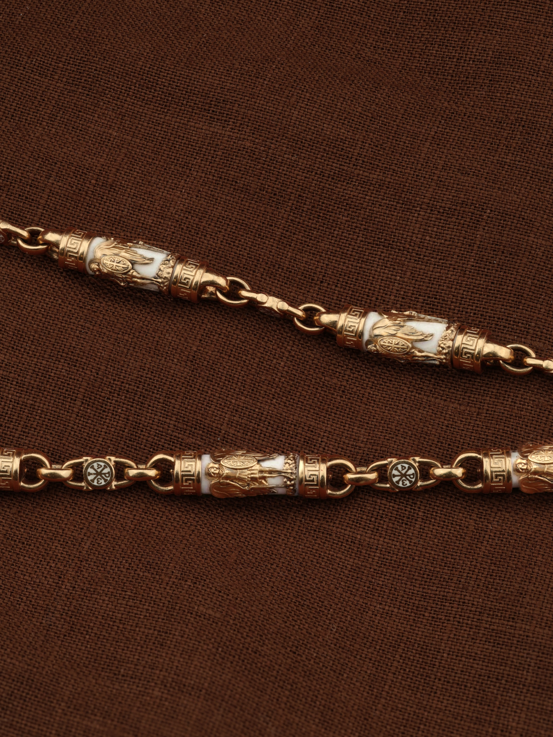 На звеньях цепи изображена Хризма — монограмма имени Христа, которая состоит из двух начальных греческих букв имени — Х (хи) и Р (ро), скрещённых между собой. По краям монограммы помещены греческие буквы a и w. Такое употребление этих букв восходит к тексту Апокалипсиса: «Аз есмь Альфа и Омега, начало и конец, говорит Господь, Который есть и был и грядет, Вседержитель.» (Откр. 1:8; см. также Откр. 22:13). Также на звеньях изображен Святой Ангел-Хранитель в виде прекрасного юноши держащего в правой руке мечь, а в левой — щит. Ангел-Хранитель — это Ангел приставляемый Богом к человеку при крещении для охраны и помощи в добрых делах. Он невидимо находится при человеке на протяжении всей его жизни, если человек сохраняет в себе любовь к Богу и истинную веру перед Ним. Ангел-Xранитель делают для нас все, что служит к истинному нашему благу и спасению. Невидимо пребывая при нас постоянно, он, руководствуя нас ко спасению, не только по нашему желанию таинственно наставляет нас на все доброе и полезное, не только возносит наши молитвы к Богу, но еще и сам от себя охраняют и защищают нас от врагов видимых и невидимых и ходатайствует за нас пред Богом. Ангел-Хранитель так любит нас, как никто на земле любить не может. Одного лишь каждому из нас он желает — спасения души; к этому он направляет все свои заботы. И если видит нас также заботящимися о спасении, радуется, если же видит нас пребывающими в нерадении о душе своей, скорбит. Но и самый великий грешник может примириться со своим Ангелом-Хранителем посредством искреннего раскаяния в грехах и оставления их навсегда. В таком случае, по слову Писания, великая радость бывает для всех ангелов на небесах (Лк. 15:10). Цепь украшена орнаментом.