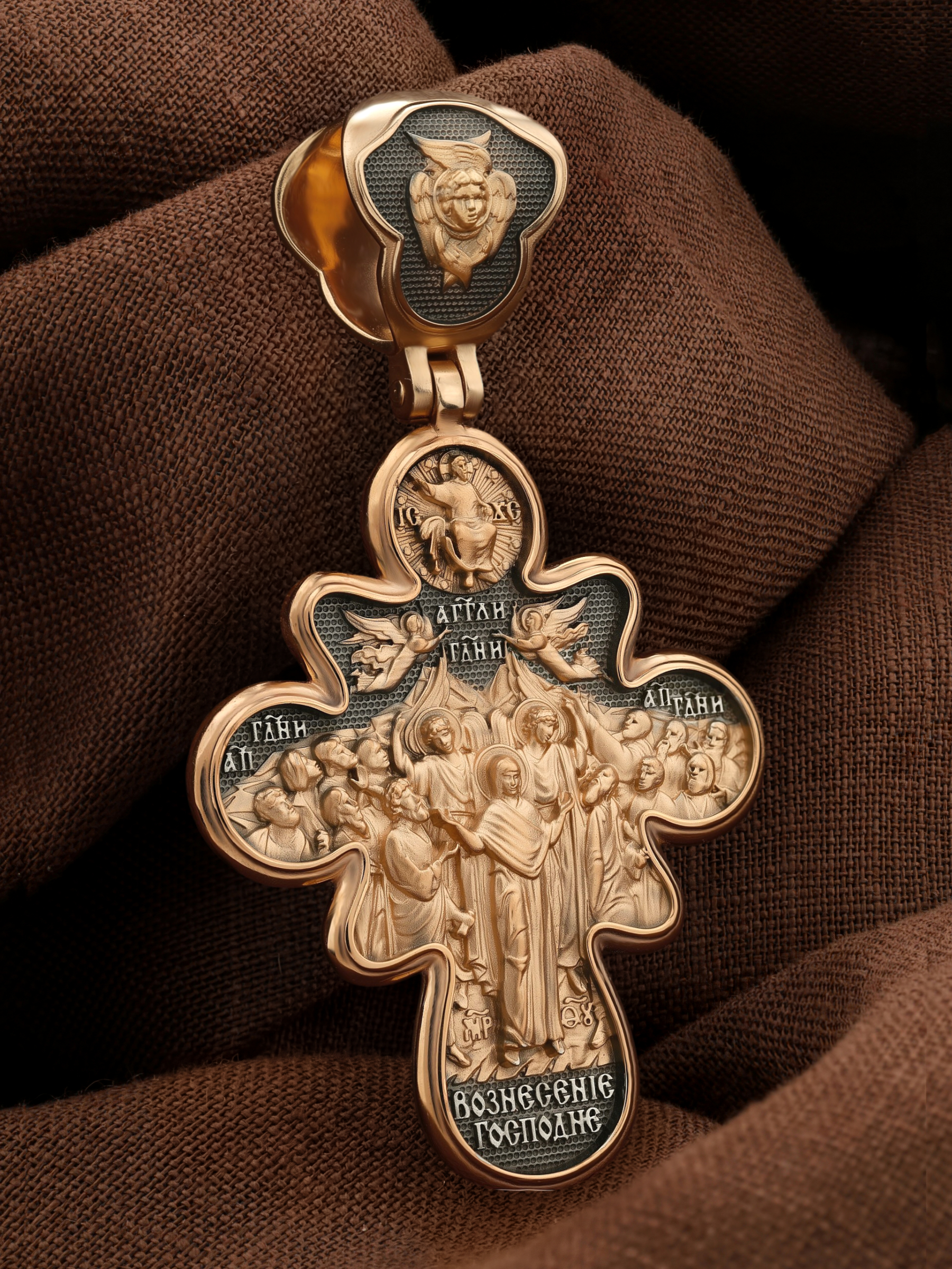 На оборотной стороне креста изображена икона Вознесение Господне. Описание события Вознесения Христова содержится в Евангелиях от Луки (Лк. 24, 50−51) и Марка (Мк. 16, 19), а также в Деяниях свв. апостолов (Деян 1, 9−11). Согласно этим повествованиям, после Своего Воскресения из мертвых Спаситель неоднократно являлся ученикам, чтобы удостоверить их в истинности Своего телесного Воскресения, укрепить в них веру и подготовить к принятию обетованного Святого Духа (Ин. 16, 7). На сороковой день после Своего Воскресения Господь Иисус Христос вывел учеников, собранных в Иерусалиме, из города в Вифанию, на гору Елеон (Деян. 1, 12). Здесь, после благословения апостолов, Он стал отдаляться от них и возноситься на небо. В Деяниях св. апостолов также упомянуто, что во время Вознесения Христова явились «два мужа в белой одежде», которые возвестили Его Второе пришествие: «Мужи галилейские! Что вы стоите и смотрите на небо? Сей Иисус, вознесшийся от вас на небо, придет таким же образом, как вы видели его восходящим на небо» (Деян. 1, 11). После Вознесения Господня ученики с радостью вернулись в Иерусалим (Лк. 24, 52), ожидая сошествия на них Святого Духа, которое произошло через несколько дней (Деян. 2, 1−4). На кулонном кольце изображен шестикрылый Ангел — Серафим.