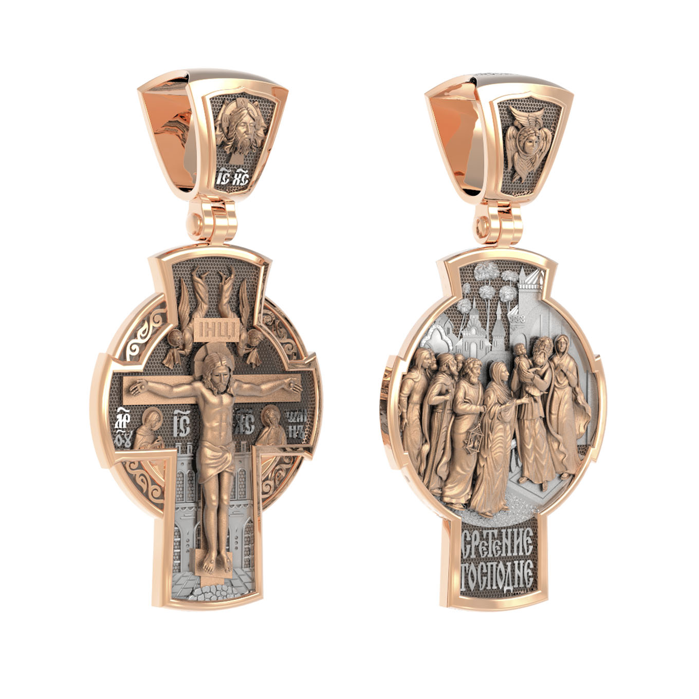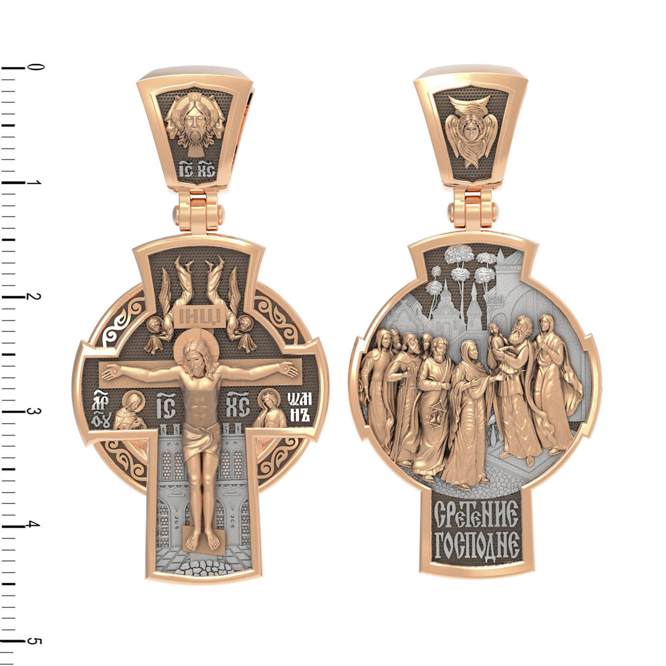 На оборотной стороне креста изображена икона Сретение Господне. В сороковой день по рождении Богомладенец был принесен в Иерусалимский храм. В это время жил в Иерусалиме праведный старец Симеон. Ему было откровение, что он не умрет, пока не увидит Христа Спасителя. По внушению свыше благочестивый старец пришел в храм в то время, когда Пресвятая Богородица и праведный Иосиф принесли туда Младенца Иисуса, чтобы исполнить законный обряд. Богоприимец Симеон взял Богомладенца на руки и, благословив Бога, изрек пророчество о Спасителе мира: «Ныне отпускаешь раба Твоего, Владыка, по слову Твоему, с миром, ибо видели очи мои спасение Твое, которое Ты уготовал пред лицем всех народов, свет к просвещению язычников и славу народа Твоего Израиля» (Лк. 2: 29–32). Пресвятой Деве праведный Симеон сказал: «Се, лежит Сей на падение и на восстание многих в Израиле и в предмет пререканий, и Тебе Самой оружие пройдет душу, да откроются помышления многих сердец». В храме была также 84-летняя вдовица Анна, пророчица, дочь Фануилова, которая постом и молитвой служила Богу в храме день и ночь. Она «славила Господа и говорила о Богомладенце всем, ожидавшим избавления в Иерусалиме». На кулонном кольце изображен шестикрылый Ангел — Серафим.