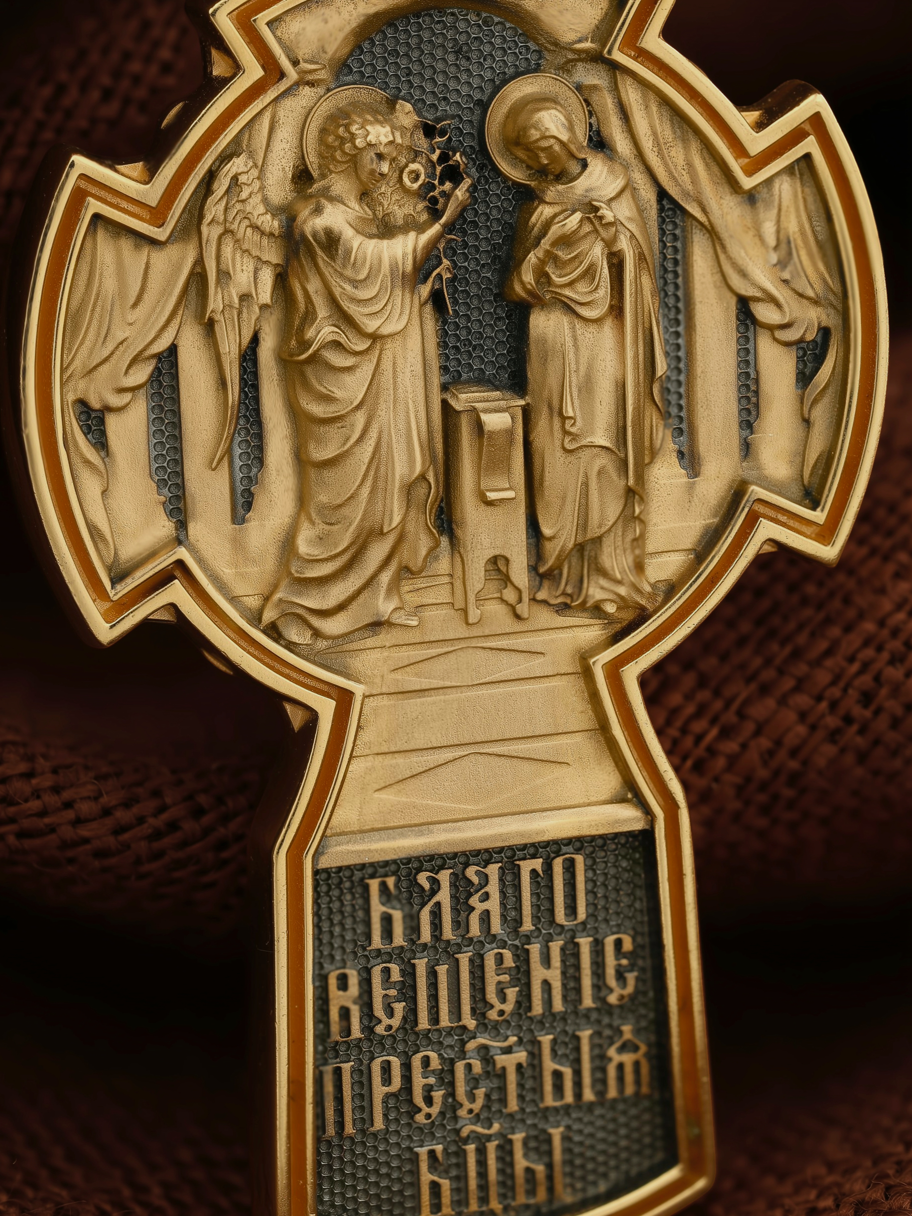 На оборотной стороне креста изображена икона «Благовещение Пресвятой Богородицы». Как нам повествует Священное Писание, Архангел Гавриил послан был от Бога в город Назарет к Пресвятой Деве Марии с радостной вестью, что Господь избрал Ее быть Матерью Спасителя мира. Ангел сказал: «Радуйся благодатная! Господь с Тобою! Благословенна Ты между женами». Мария cмутилась от слов Ангела и думала: что значит это приветствие? Ангел же продолжал говорить Ей: «не бойся, Мария, ибо Ты обрела благодать у Бога. И вот, Ты родишь Сына и наречешь имя Ему Иисус. Он будет велик, и назовется сыном Всевышнего, и Царству Его не будет конца…» На кулонном кольце изображен Ангел Серафим.