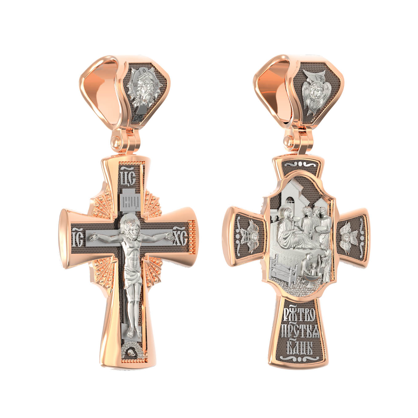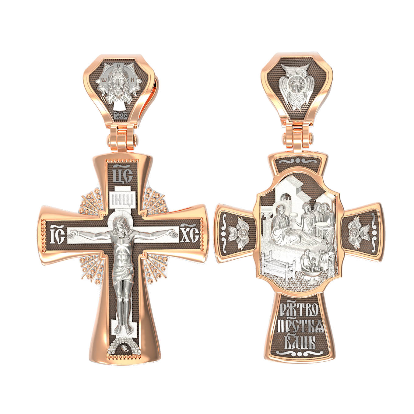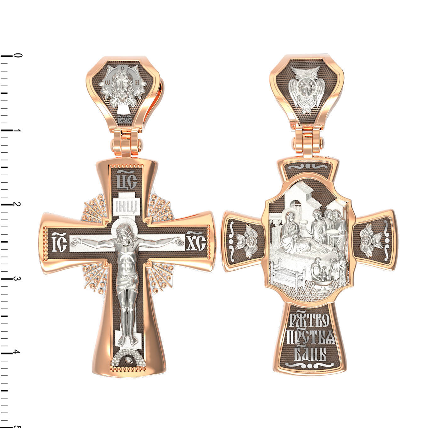 На оборотной стороне креста изображена икона Рождество Пресвятой Богородицы. Согласно церковному Преданию, Пресвятая Дева Мария родилась в небольшом галилейском городе Назарете. Родителями Её были праведные Иоаким и Анна. Супруги были бездетны, но не теряли надежды, что Господь может разрешить неплодство Анны даже в её преклонном возрасте. Они горячо молились и просили Господа даровать им дитя, которое обещали посвятить Богу для служения в храме. И Господь услышал их молитвы: Праведная Анна зачала и разрешилась дочерью Марией — будущей Пресвятой Богородицей. На кулонном кольце изображен шестикрылый Ангел — Серафим.