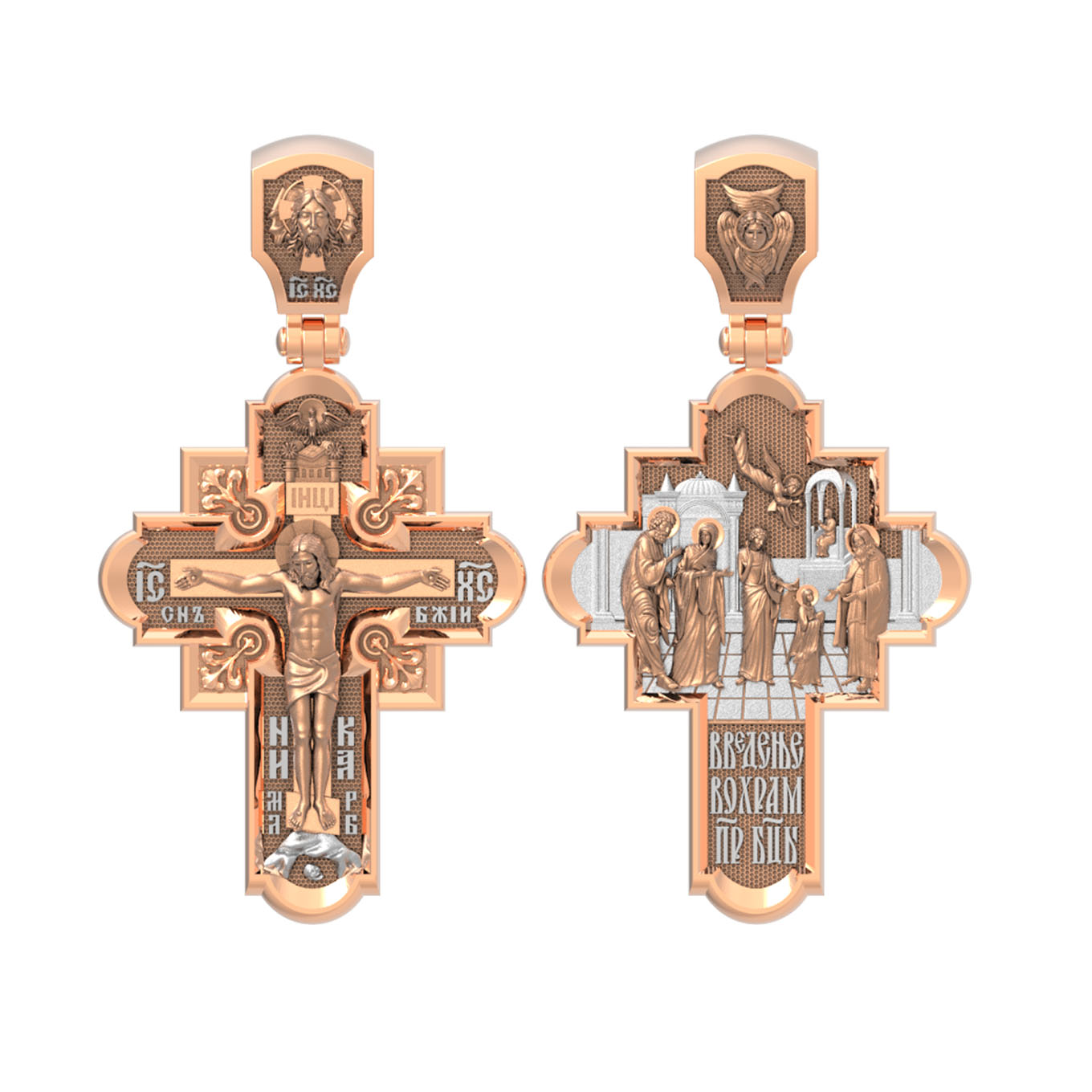 На оборотной стороне креста изображена икона Введение во Храм Пресвятой Богородицы. По сохраненным Преданием рассказам, родители Девы Марии, праведные Иоаким и Анна, молясь о разрешении неплодства, дали обет, если родится дитя, посвятить его на служение Богу. Когда Пресвятой Деве исполнилось три года, святые родители решили выполнить свое обещание. Собрав родственников и знакомых, одев Пречистую Марию в лучшие одежды, с пением священных песней, с зажженными свечами в руках привели ее в Иерусалимский храм. Там встретил отроковицу первосвященник со множеством священников. В храм вела лестница в пятнадцать высоких ступеней. Младенец Мария, казалось, не могла бы Сама взойти по этой лестнице. Но как только Ее поставили на первую ступень, укрепляемая силой Божией, Она быстро преодолела остальные ступени и взошла на верхнюю. Затем первосвященник, по внушению свыше, ввел Пресвятую Деву в Святое святых, куда из всех людей только раз в году входил первосвященник с очистительной жертвенной кровью. Все присутствовавшие в храме дивились необыкновенному событию. На кулонном кольце изображен шестикрылый Ангел — Серафим.