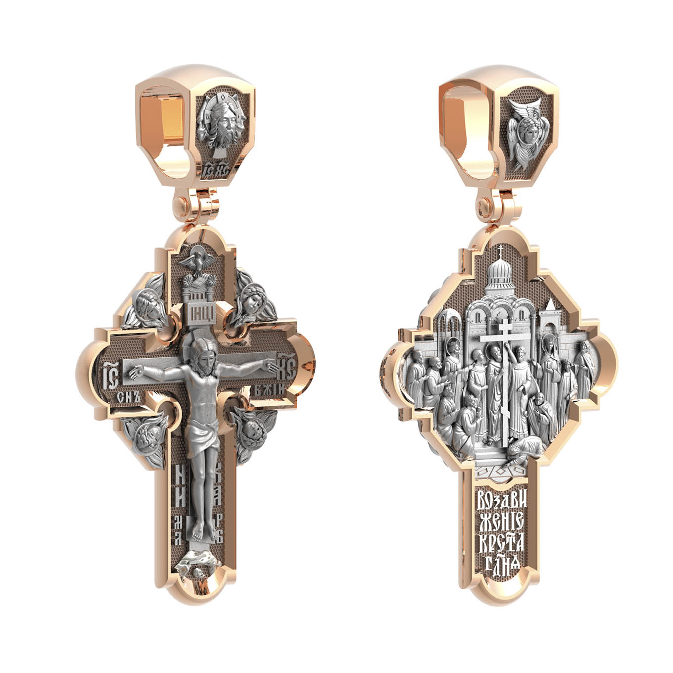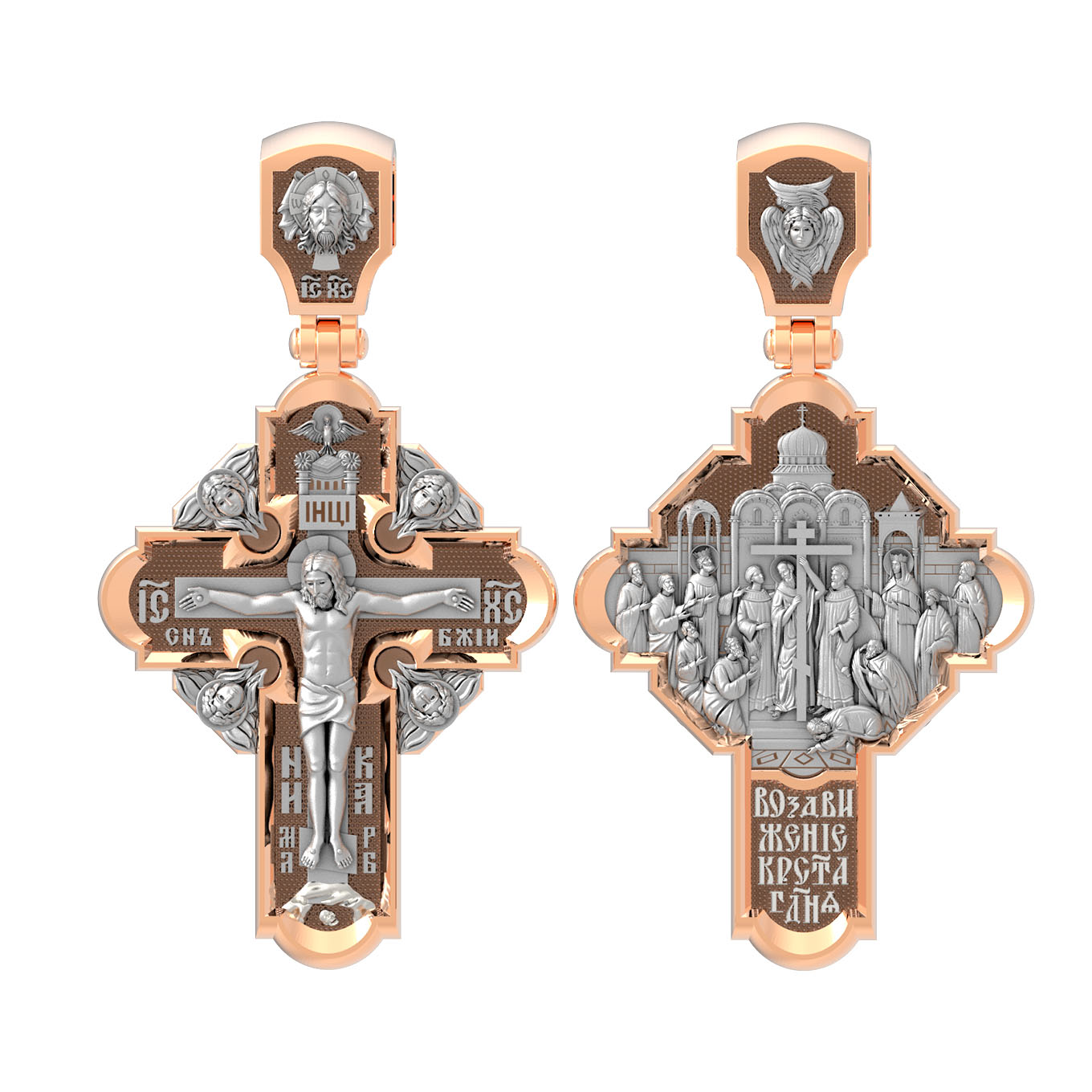 На оборотной стороне креста изображена икона Воздвижение Честного и Животворящего Креста Господня. Равноапостольный царь Константин пожелал построить храмы Божии на священных для христиан местах в Палестине и найти Крест, на котором был распят Спаситель. Исполнить желание царя взялась, с великою радостью, его мать, св. равноапостольная царица Елена. Крест был обретен в 326 году около горы Голгофы в Иерусалиме. C VII века с этим днём стали соединять память о возвращении Животворящего Креста из Персии византийским императором Ираклием (629). Праздник называется Воздвижением Креста, потому что и при обретении, и при возвращении Креста патриарх Макарий поднимал (Воздвигал) крест три раза, чтобы все могли его видеть. Народ же, видя Крест Спасителя, кланялся и восклицал: «Господи, помилуй!». Св. равноапостольные цари Константин и Елена, над местом страданий, погребения и воскресения Иисуса Христа построили обширный и великолепный храм в честь Воскресения Христова. На кулонном кольце изображен шестикрылый Ангел — Серафим.