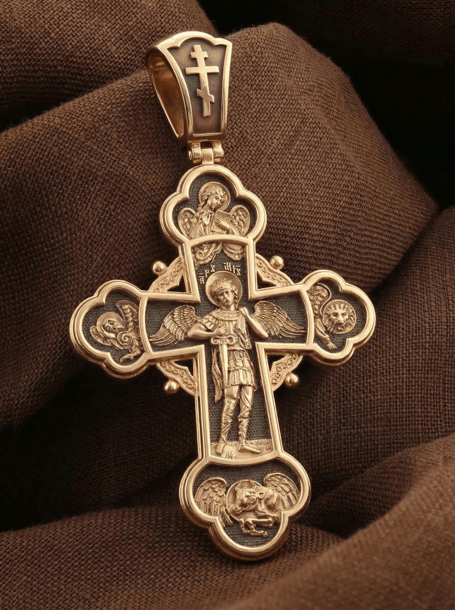 В центре оборота креста изображен Архистратиг Михаил. Могучий Архангел почитается как покровитель воинов и всех верных Богу и ведущих борьбу против сил зла, а также защитник душ умерших, страж райских врат. Над ним благословляющая десница — знак присутствия Бога. Архангел изображен в окружении символов четырех евангелистов: орел (Иоанн), лев (Марк), телец (Лука) и ангел (Матфей).