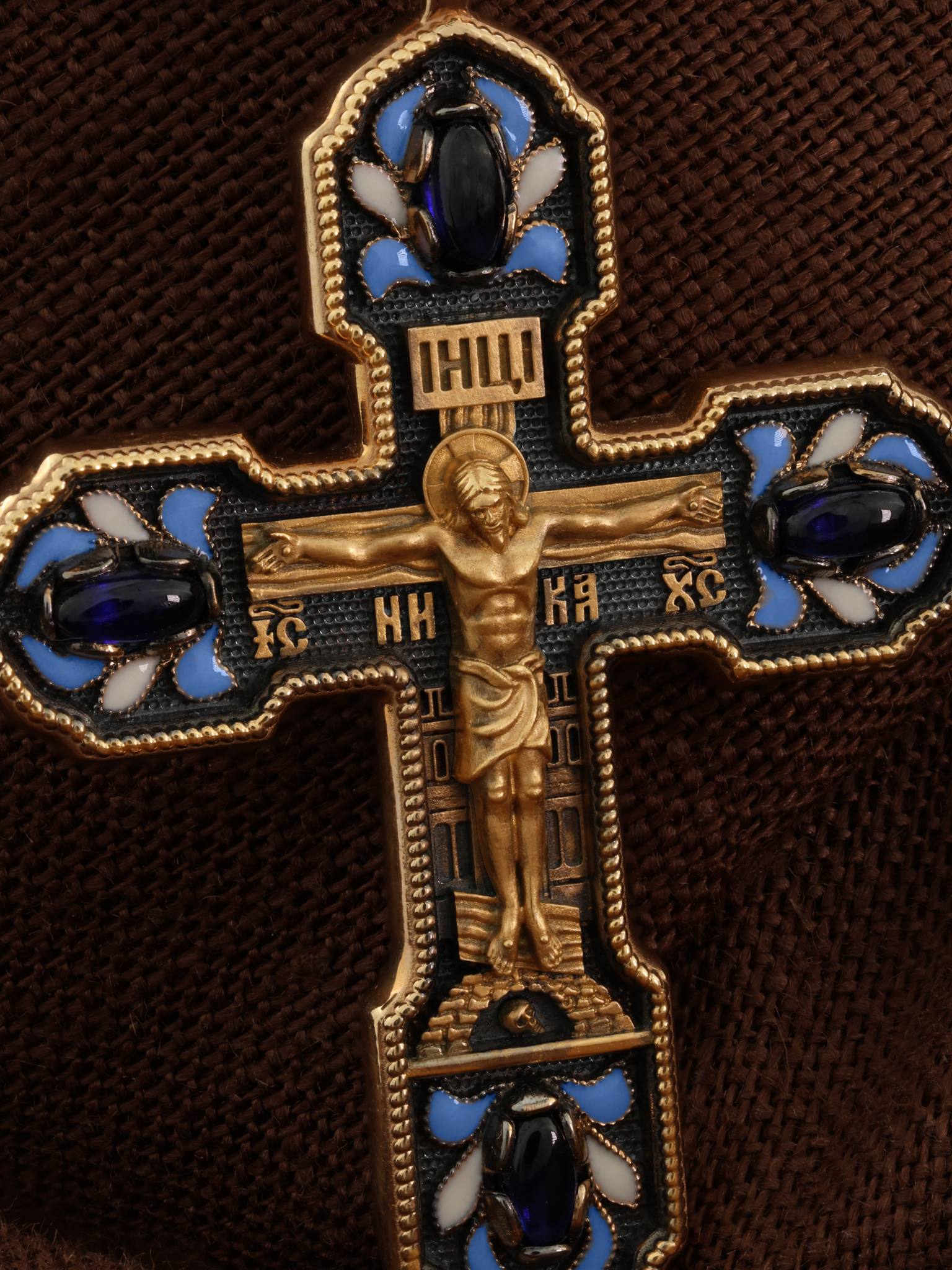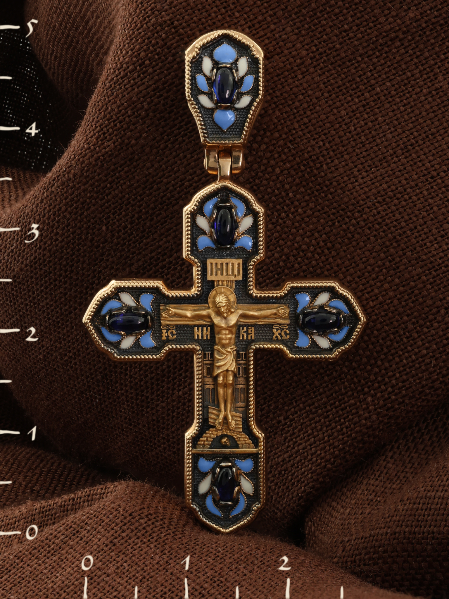 В верхней части Распятия у изголовья Иисуса Христа видна табличка с аббревиатурой «IНЦI» — «Иисус Назорей Царь Иудейский», которая, согласно Евангелию, была прибита к кресту после Его Распятия. Внизу, у подножия Господа, можно увидеть гору Голгофу с Главой Адамовой в пещере. Сам образ Распятия сопровождается каноническими надписями. Это святое имя Христа, которое принято писать на иконах сокращенно — «ИС ХС», словосочетание «СЫН БОЖИЙ», что означает божественную природу Иисуса Христа, и надпись «НИКА», обозначающая «победитель».