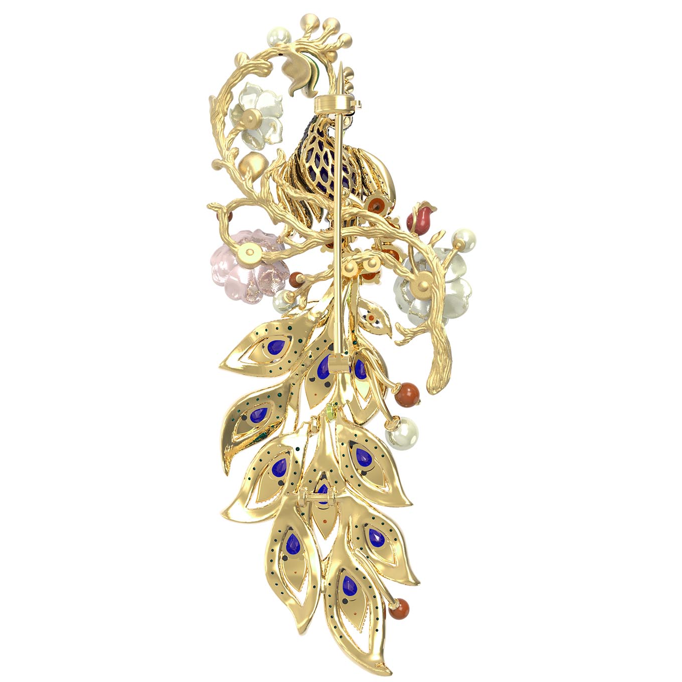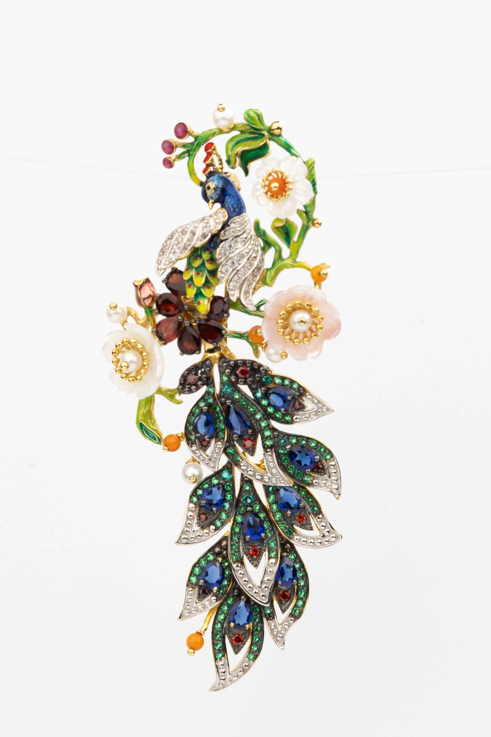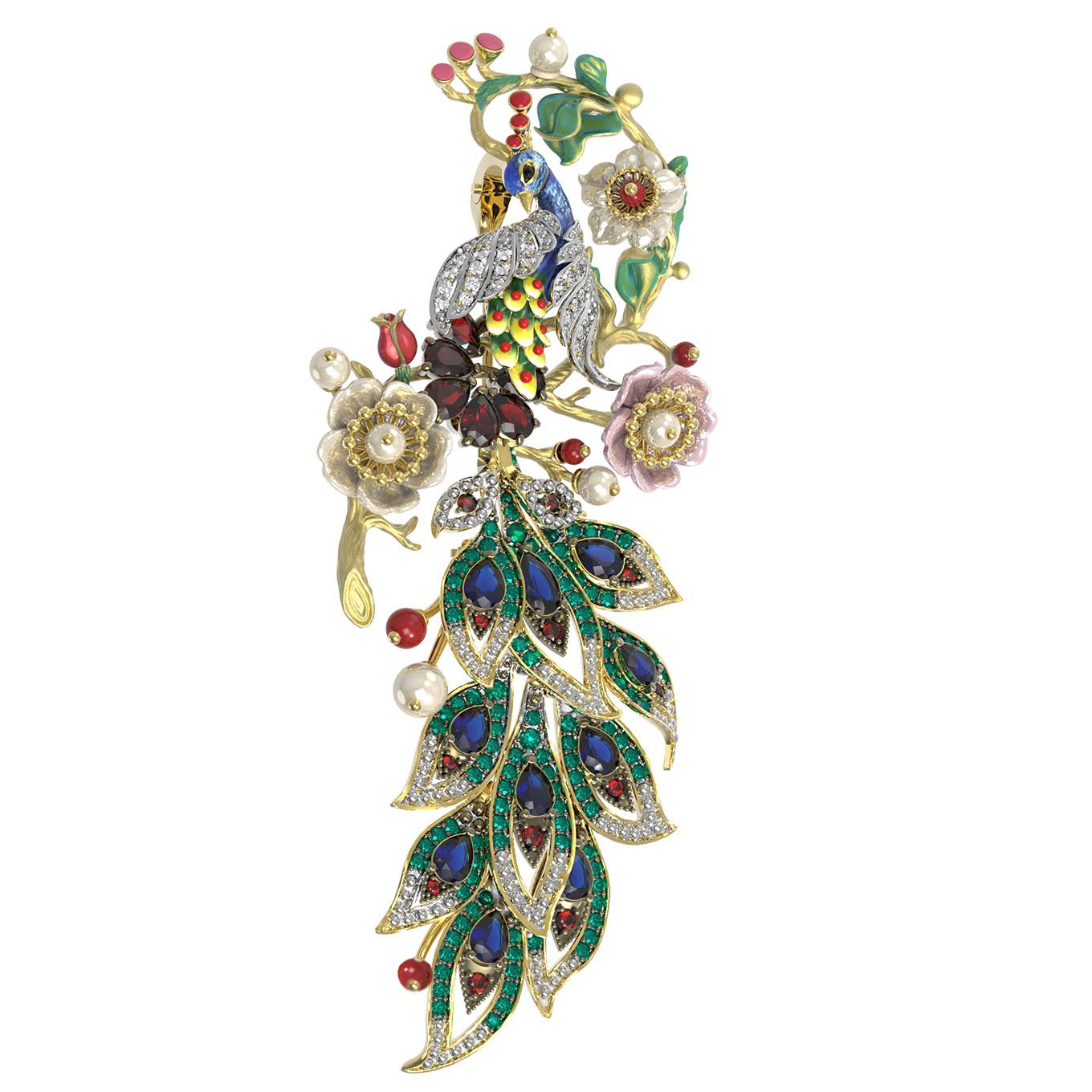 Брошь из лимонного золота c эмаль, фианитом, гранатом, жемчугом, сапфиром, кораллом и перламутром