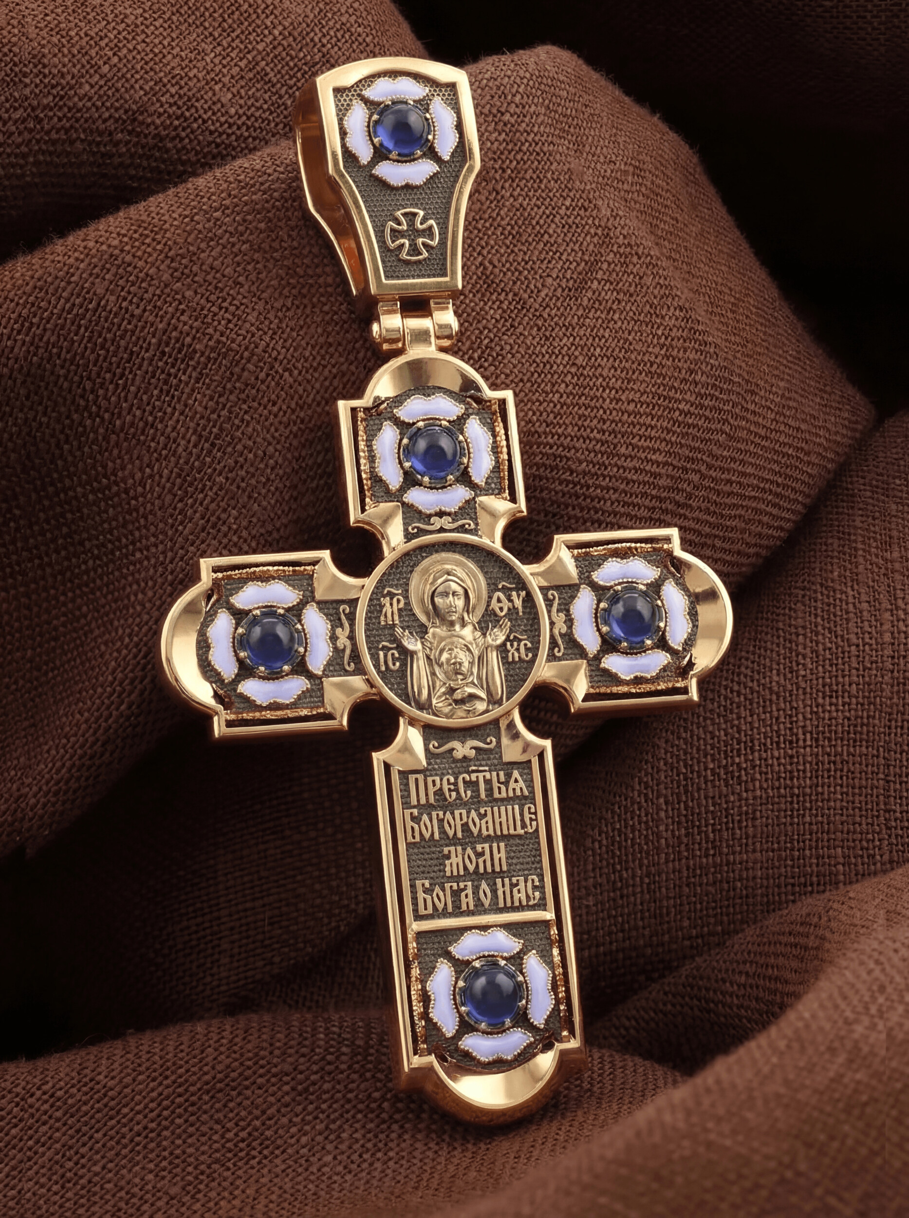 На оборотной стороне креста изображена икона Божией Матери «Знамение». Икона изображает Пресвятую Богородицу, молитвенно поднимающую Свои руки: на груди Ее, на фоне круглого щита, — благословляющий Божественный Младенец — Спас-Эммануил. Богоматерь изображена по пояс. Иконы Божией Матери, известные под именем «Знамение», появились на Руси в XI — XII веках, а называться так стали после чудесного знамения от Новгородской иконы, случившегося в 1170 году. Многочисленные списки с иконы Знамения известны по всей России. Многие из них просияли чудесами в местных храмах и были наименованы по месту явления чудес.