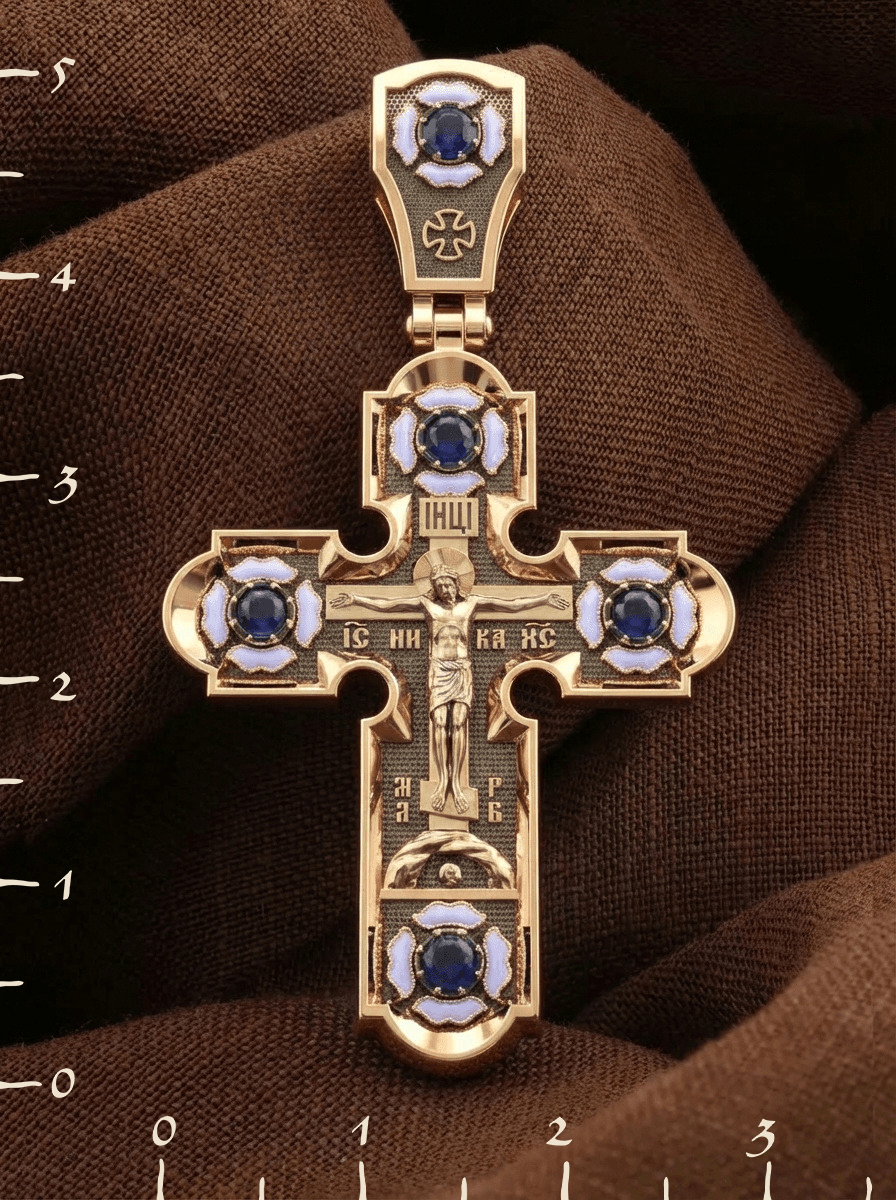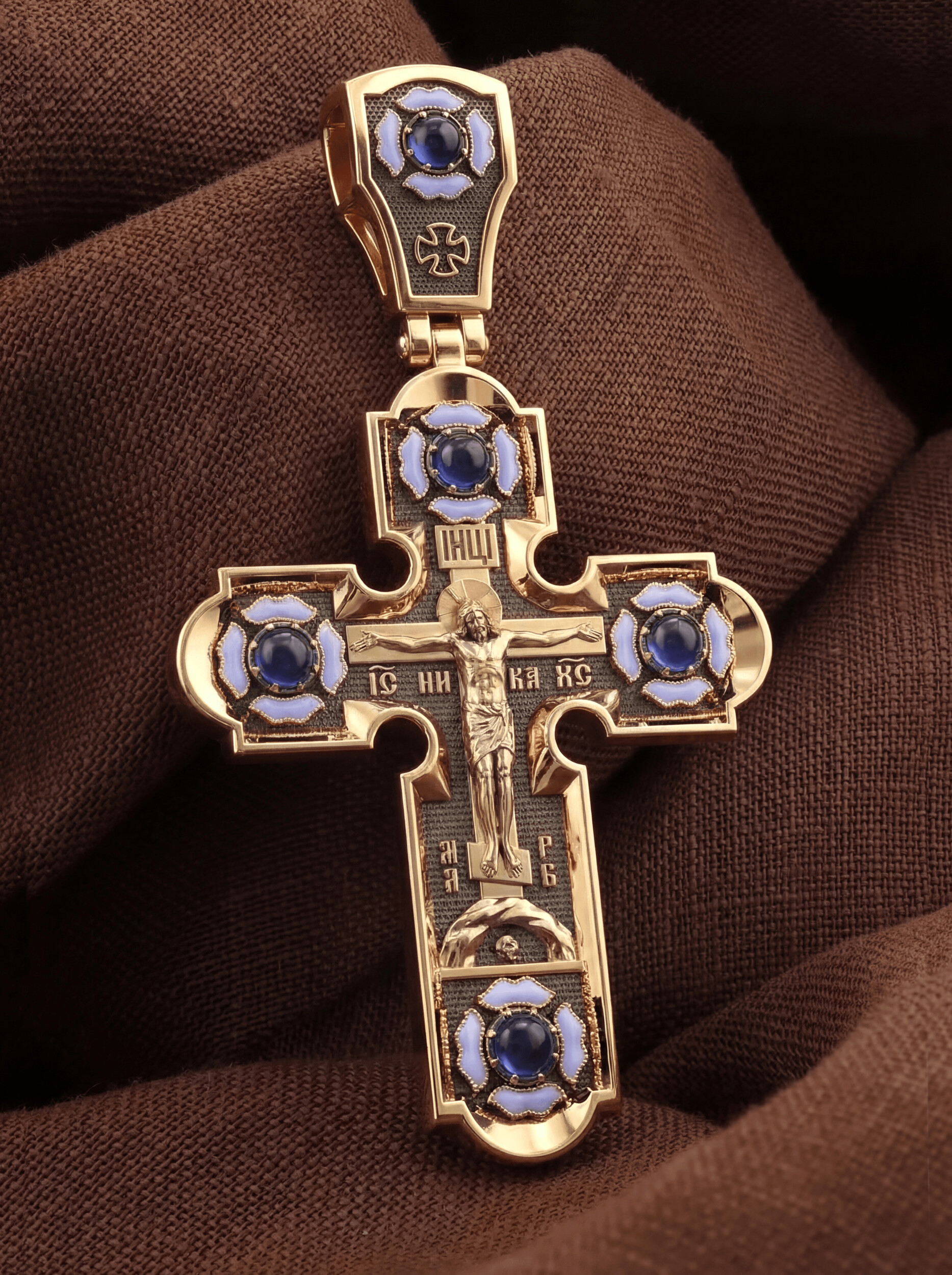 На лицевой стороне креста изображено Распятие Господа и Спасителя нашего Иисуса Христа. Христос, подвергнутый на кресте мучительной казни, своими страданиями искупил нас от древнего греха и даровал нам жизнь вечную. На верхней табличке, выше головы Иисуса, расположена надпись, составленная Понтием Пилатом — «IНЦI». Она означает «Иисус Назорей, Царь Иудейский». Надпись «IС» « ХС» означает Иисус Христос и слово «НИКА», что означает «победитель», помещаются на разных сторонах поперечной перекладины креста. В нижней части креста находится надпись «МЛРБ» — «место лобное рай бысть» означает, что место лобное стало раем. Крест стоит на горе камней, символизирующих Голгофу. Под подножием Креста изображена покоящаяся голова (череп) Адама, грехи которого Христос омыл Своею Кровью. Христос в Своей Божественной любви, над которой смерть не властна и которая, страдая, и не страдает в обычном смысле, простирает к людям со Креста Свои объятия, в которые призывается и привлекается весь мир.