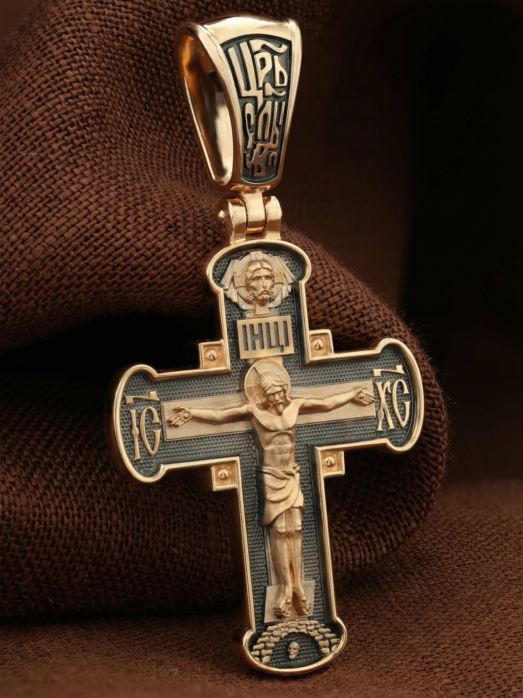 На лицевой стороне креста изображено Распятие Господа и Спасителя нашего Иисуса Христа, отдавшего Себя на смерть, для искупления грехов мира. Крест является символом жертвенной любви Всеблагого Бога к падшим людям, всепобеждающим духовным оружием христиан, основанием и средоточием церковной жизни. Господь сказал: «кто хочет идти за Мною, отвергнись себя, и возьми крест свой, и следуй за Мною». (Мк. 8: 34). На кулонном кольце помещена надпись «Царь Славы». На верхней табличке, выше головы Иисуса, расположена надпись, составленная Понтием Пилатом — «IНЦI». Она означает «Иисус Назорей, Царь Иудейский». Над ней — Нерукотворный образ Господа и Спасителя нашего Иисуса Христа, чудесно отпечатавшийся на плате, котором Христос вытер свой лик. Надпись «IC» «ХC», означает Иисус Христос, помещается на разных сторонах поперечной перекладины креста. Крест стоит на горе камней, символизирующих Голгофу. В ее основании различается череп– это голова Адама.