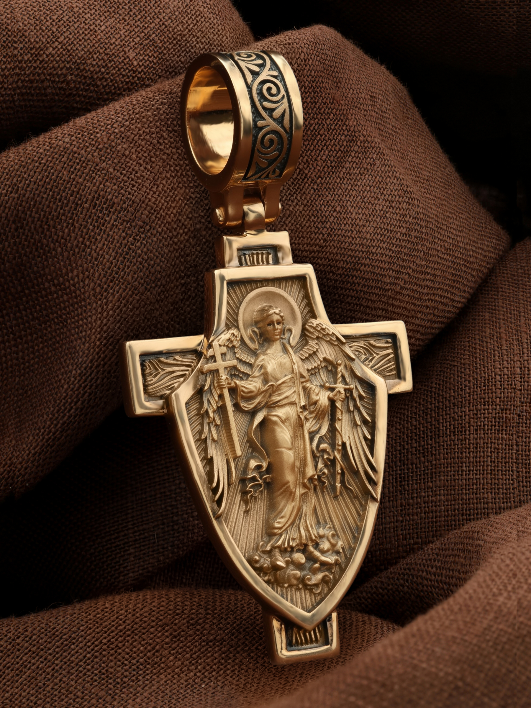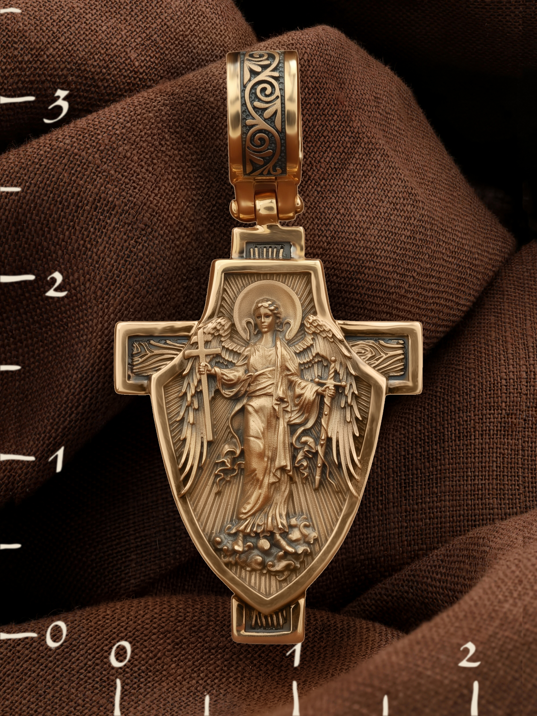 Основой композиции является изображение Святого Ангела-Хранителя держащего в правой руке крест, а в левой — мечь. Он изображен на фоне воинского щита. Крест является символом жертвенной любви всеблагого Бога к падшим людям, всепобеждающим духовным оружием христиан, основанием и средоточием церковной жизни. Господь сказал: «кто хочет идти за Мною, отвергнись себя, и возьми крест свой, и следуй за Мною». (Мк. 8: 34). Ангел-Хранитель — это Ангел приставляемый Богом к человеку при крещении для охраны и помощи в добрых делах. Он невидимо находится при человеке на протяжении всей его жизни, если человек сохраняет в себе любовь к Богу и истинную веру перед Ним. Ангел-Xранитель делают для нас все, что служит к истинному нашему благу и спасению. Невидимо пребывая при нас постоянно, он, руководствуя нас ко спасению, не только по нашему желанию таинственно наставляет нас на все доброе и полезное, не только возносит наши молитвы к Богу, но еще и сам от себя охраняют и защищают нас от врагов видимых и невидимых и ходатайствует за нас пред Богом. Ангел-Хранитель так любит нас, как никто на земле любить не может. Одного лишь каждому из нас он желает — спасения души; к этому он направляет все свои заботы. И если видит нас также заботящимися о спасении, радуется, если же видит нас пребывающими в нерадении о душе своей, скорбит. Но и самый великий грешник может примириться со своим Ангелом-Хранителем посредством искреннего раскаяния в грехах и оставления их навсегда. В таком случае, по слову Писания, великая радость бывает для всех ангелов на небесах (Лк. 15:10).