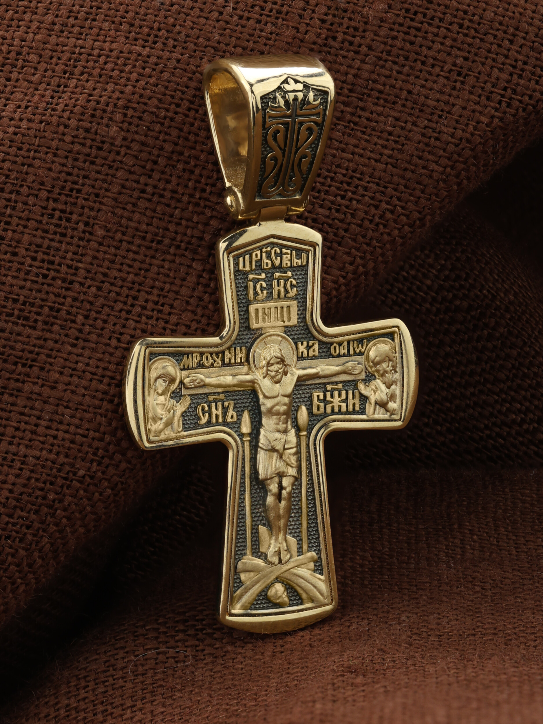 На лицевой стороне креста изображено Распятие Господа и Спасителя нашего Иисуса Христа, отдавшего Себя на смерть, для искупления грехов мира. Крест является символом жертвенной любви Всеблагого Бога к падшим людям, всепобеждающим духовным оружием христиан, основанием и средоточием церковной жизни. Господь сказал: «кто хочет идти за Мною, отвергнись себя, и возьми крест свой, и следуй за Мною». (Мк. 8: 34). На кулонном кольце изображен процветший крест. На верхней табличке, выше головы Иисуса, расположена надпись, составленная Понтием Пилатом — «IНЦI». Она означает «Иисус Назорей, Царь Иудейский». Распятие сопровождается каноническими надписями. Выше Распятия помещена надпись «Царь Славы» и надпись «IC» «ХC», означает Иисус Христос. Слово «НИКА», что означает «победитель» и надпись «Сын Божий», что означает божественную природу Иисуса Христа, помещаются на разных сторонах поперечной перекладины креста. Слева от Распятия изображена Пресвятая Богородица, справа — Про¬рок Предтеча и Креститель Господень Иоанн. Вдоль креста помещены Орудия Страстей Господних — копие сотника Лонгина и трость с губкой. Крест стоит на горе камней, символизирующих Голгофу. В ее основании различается череп– это голова Адама. На православном кресте Христос не умирает, а свободно простирает руки, ладони Иисуса открыты, будто он хочет обнять все человечество, даря им свою любовь и открывая путь к вечной жизни.