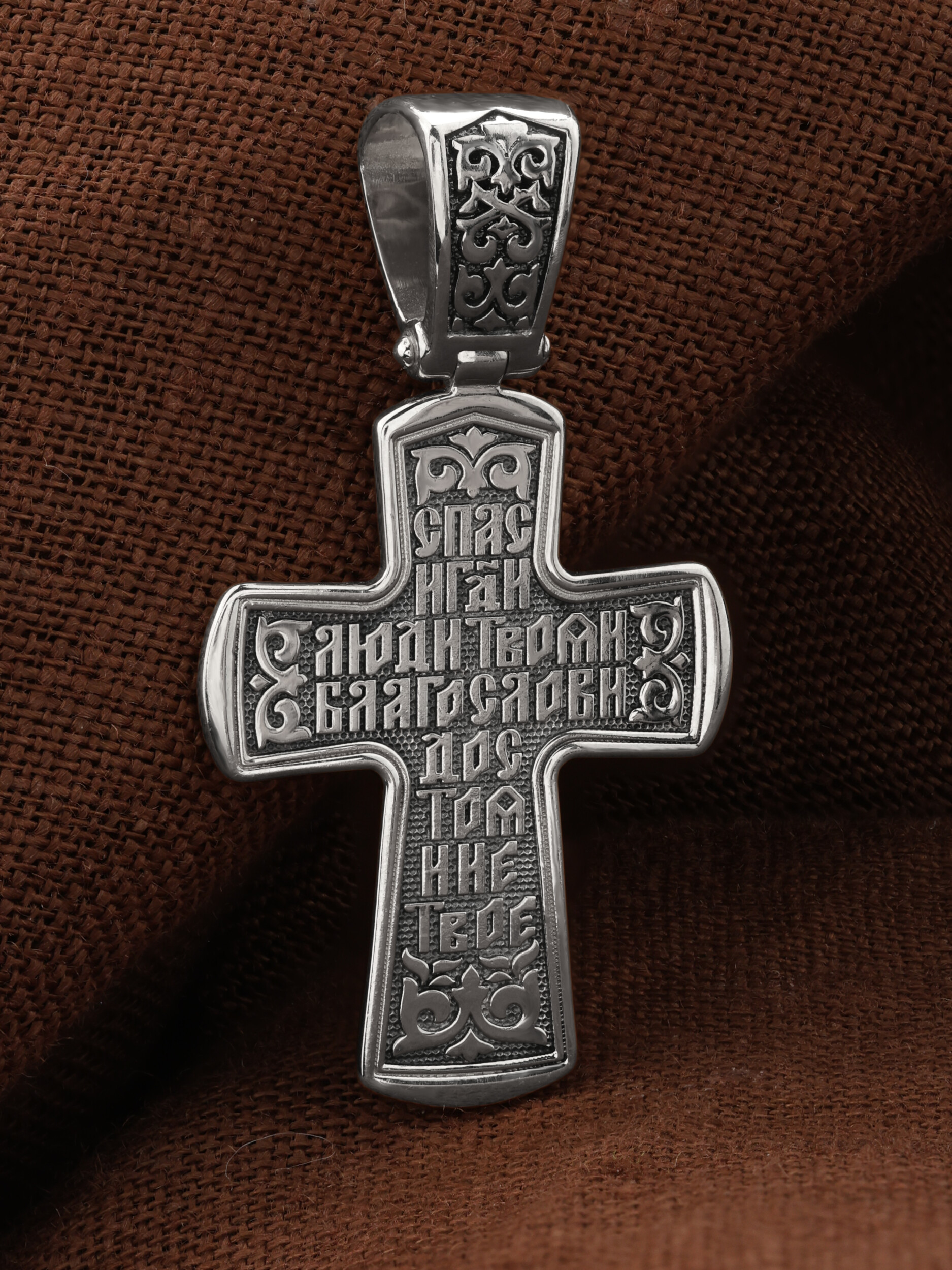 На лицевой стороне креста изображено Распятие Господа и Спасителя нашего Иисуса Христа, отдавшего Себя на смерть, для искупления грехов мира. Крест является символом жертвенной любви Всеблагого Бога к падшим людям, всепобеждающим духовным оружием христиан, основанием и средоточием церковной жизни. Господь сказал: «кто хочет идти за Мною, отвергнись себя, и возьми крест свой, и следуй за Мною». (Мк. 8: 34). На кулонном кольце изображен процветший крест. На верхней табличке, выше головы Иисуса, расположена надпись, составленная Понтием Пилатом — «IНЦI». Она означает «Иисус Назорей, Царь Иудейский». Распятие сопровождается каноническими надписями. Выше Распятия помещена надпись «Царь Славы» и надпись «IC» «ХC», означает Иисус Христос. Слово «НИКА», что означает «победитель» и надпись «Сын Божий», что означает божественную природу Иисуса Христа, помещаются на разных сторонах поперечной перекладины креста. Слева от Распятия изображена Пресвятая Богородица, справа — Про¬рок Предтеча и Креститель Господень Иоанн. Вдоль креста помещены Орудия Страстей Господних — копие сотника Лонгина и трость с губкой. Крест стоит на горе камней, символизирующих Голгофу. В ее основании различается череп– это голова Адама. На православном кресте Христос не умирает, а свободно простирает руки, ладони Иисуса открыты, будто он хочет обнять все человечество, даря им свою любовь и открывая путь к вечной жизни.