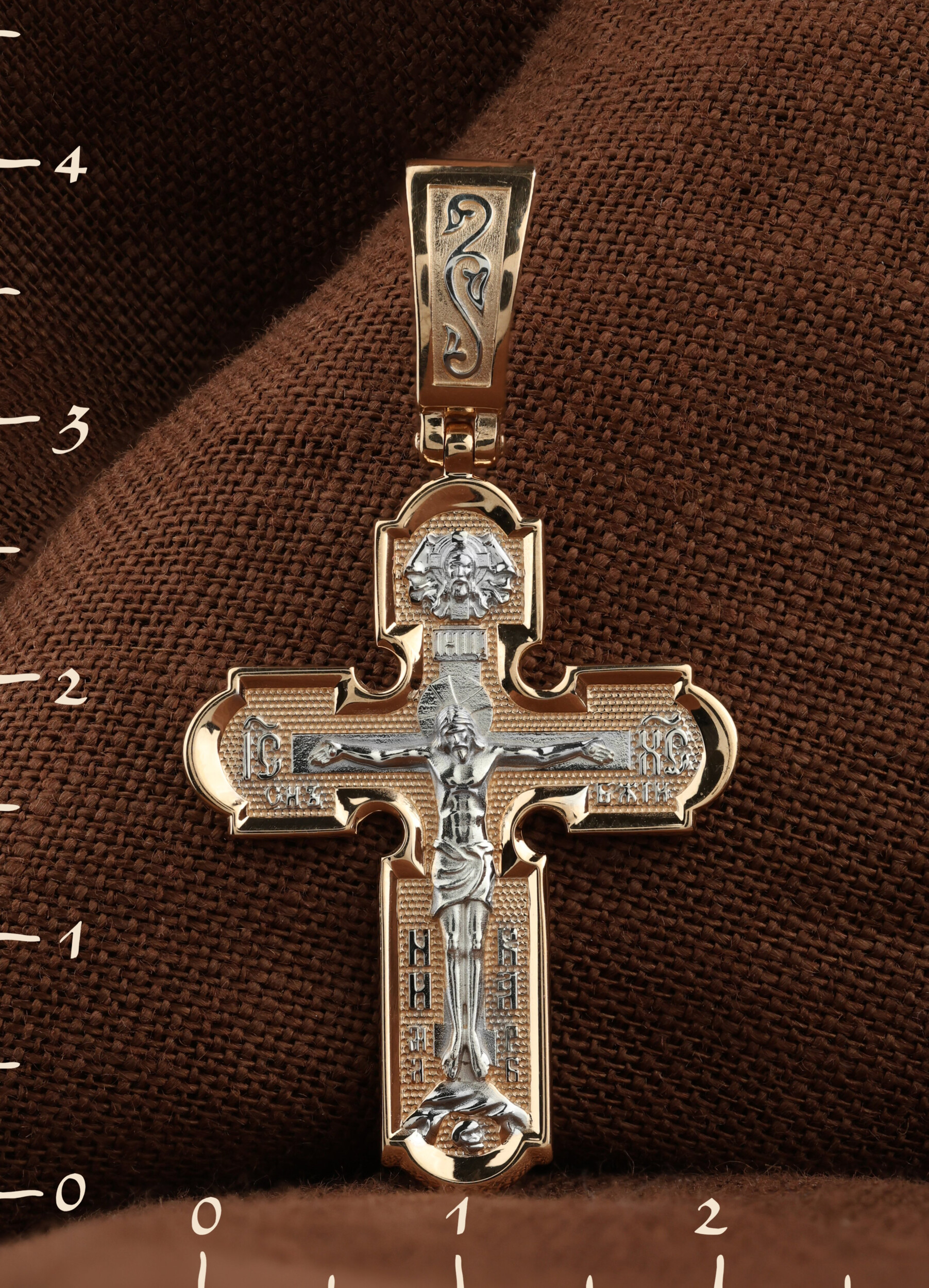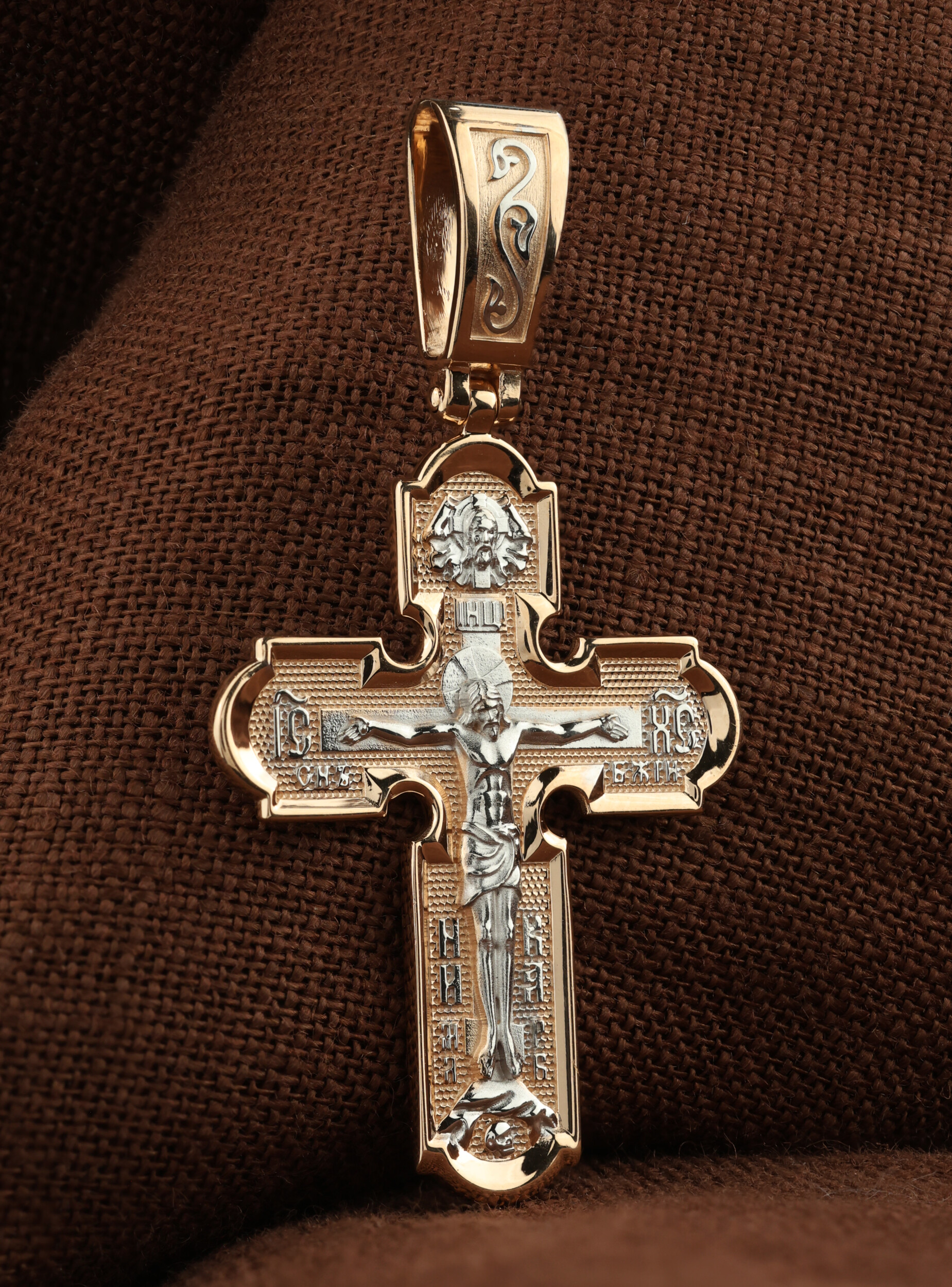 На лицевой стороне нательного креста по традиции изображено Распятие Господа нашего Иисуса Христа. Крест Господень стоит на небольшом каменистом возвышении, символизирующем гору Голгофу, которая обозначена буквами МЛРБ (Место Лобное Рай Бысть). Над головой Господа на поперечной перекладине написано «ИНЦИ», что символизирует табличку, которая была прибита к Кресту, с надписью «Иисус Назорей Царь Иудейский». Этим иудеи хотели посмеяться над Христом, не зная, что распинают истинного Царя всех царей. По сторонам основной перекладины расположены позолоченные рельефные инициалы Христа «ИС ХС». Под перекладиной, по сторонам древа, находится надпись «СЫН БОЖИЙ», а в основании креста — надпись «НИКА» (Победитель).