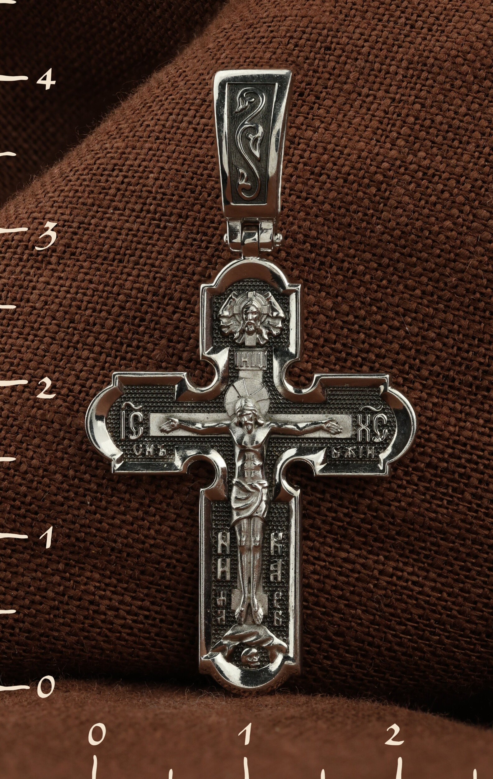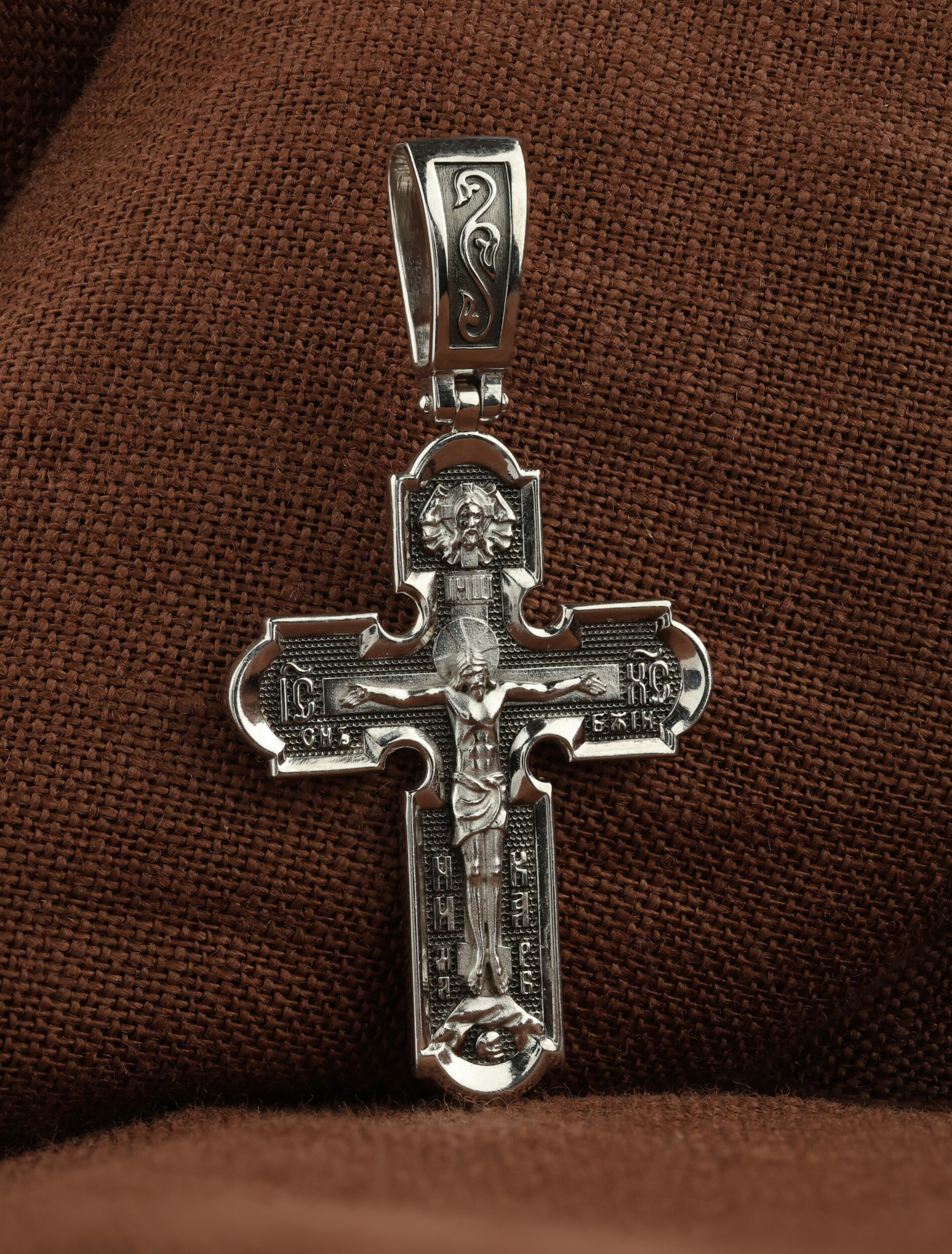 На лицевой стороне нательного креста по традиции изображено Распятие Господа нашего Иисуса Христа. Крест Господень стоит на небольшом каменистом возвышении, символизирующем гору Голгофу, которая обозначена буквами МЛРБ (Место Лобное Рай Бысть). Над головой Господа на поперечной перекладине написано «ИНЦИ», что символизирует табличку, которая была прибита к Кресту, с надписью «Иисус Назорей Царь Иудейский». Этим иудеи хотели посмеяться над Христом, не зная, что распинают истинного Царя всех царей. По сторонам основной перекладины расположены позолоченные рельефные инициалы Христа «ИС ХС». Под перекладиной, по сторонам древа, находится надпись «СЫН БОЖИЙ», а в основании креста — надпись «НИКА» (Победитель).