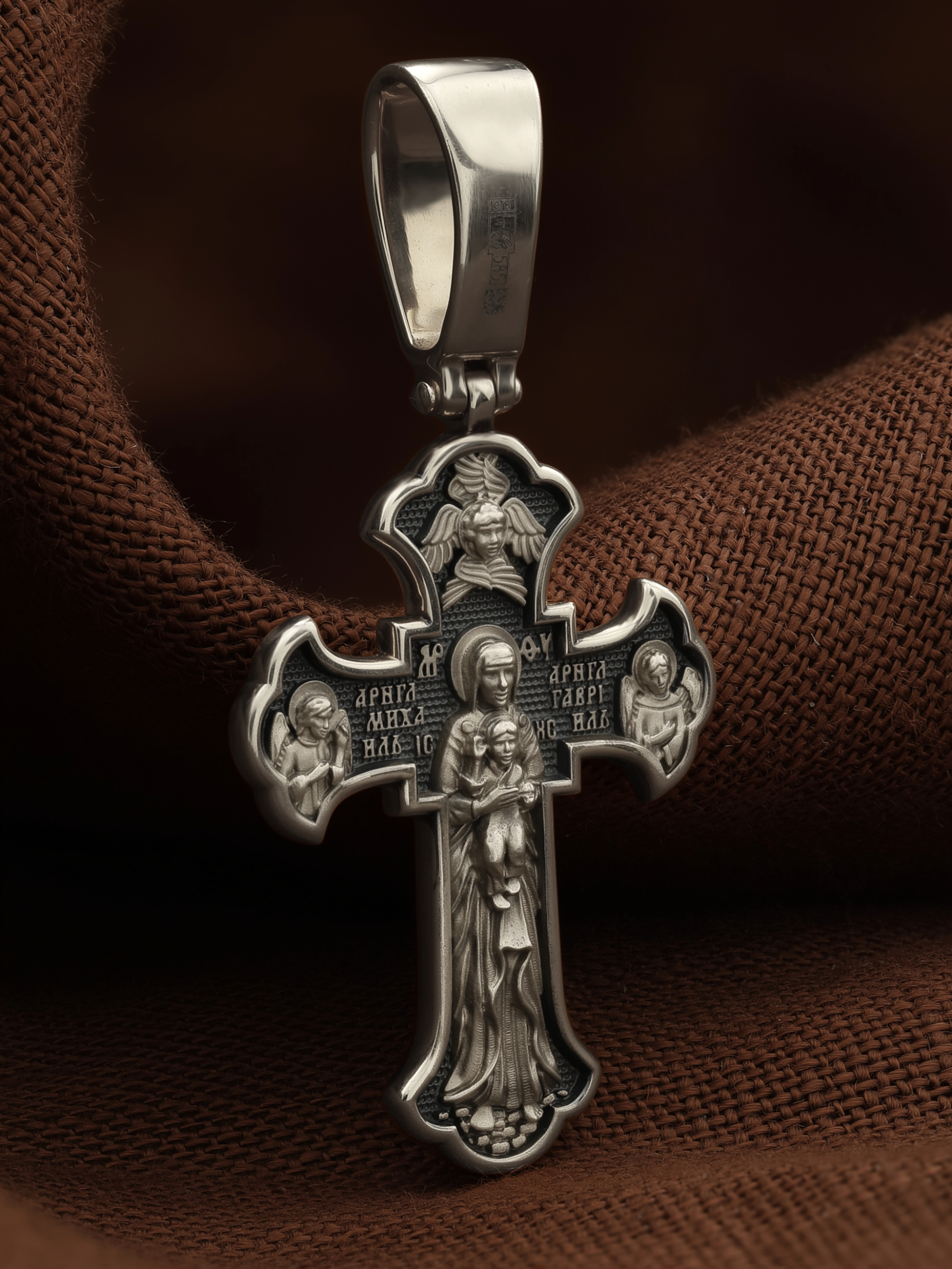На обратной стороне креста в полный рост изображена Валаамская икона Божией Матери, над которой раскрыл свои крылья серафим. Этот образ написал в 1878 году иеромонах Валаамского монастыря о. Алипий. Валаамскую икону прославили многие чудеса, ее считают целительницей при разных недугах. Перед этим образом Богородицу молят в первую очередь об укреплении веры, просят даровать смирение, твердость в соблюдении заповедей Христовых и об исцелении. Богородице предстоят два архангела, Михаил и Гавриил.