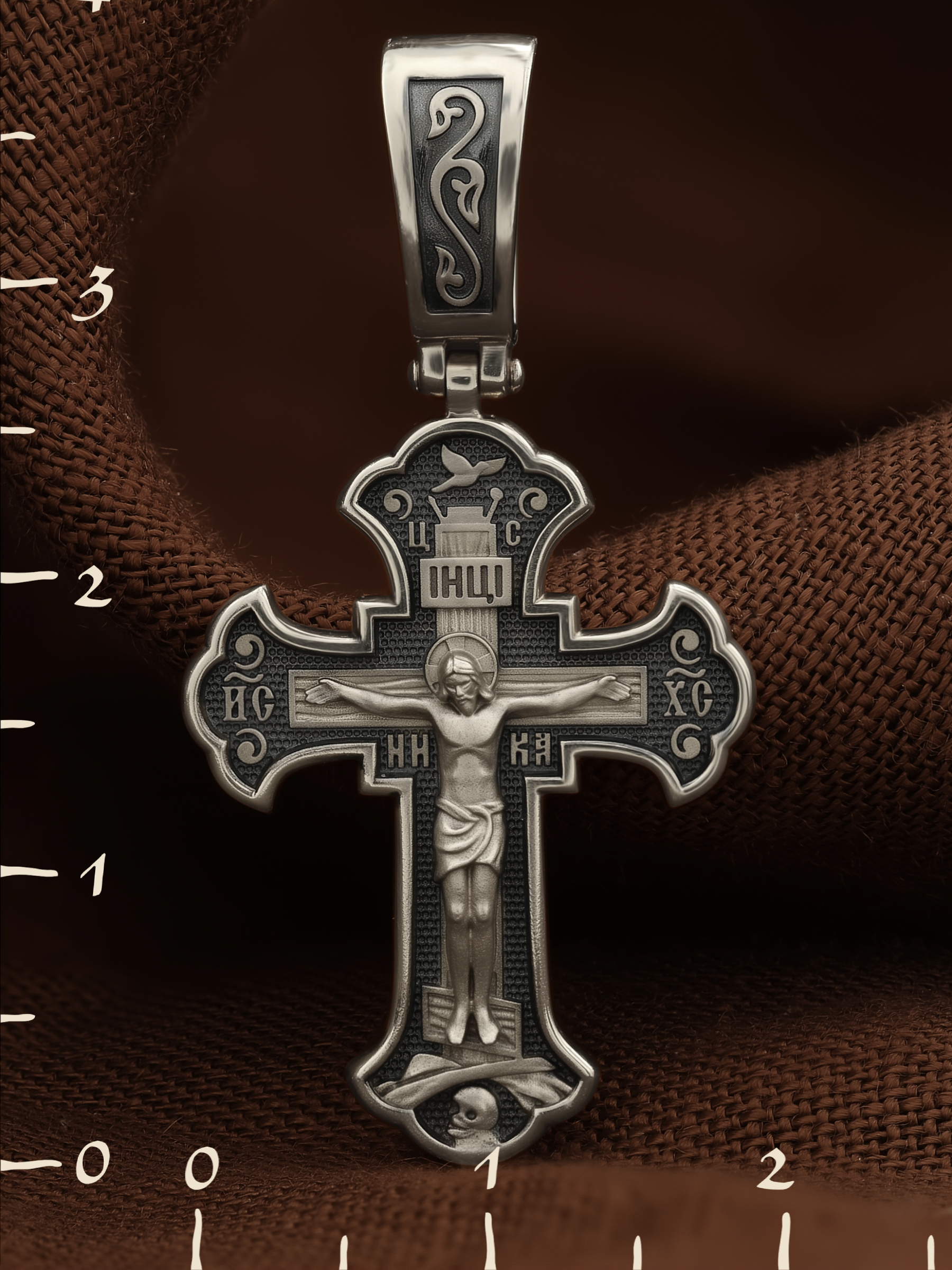 Над титлом помещена аббревиатура «ЦС» (Царь Славы). Верхняя перекладина символизирует собой табличку с надписью «IHЦI» — Иисус Назарянин Царь Иудейский. Возле перекладины пишется сокращенно имя Спасителя «IC XC» — Иисус Христос, ниже перекладины добавляется: «НИКА» (греч. — Победитель). Возвышение, на котором стоит Крест, символизирует гору Голгофу, на которой произошло Распятие. У подножия Креста изображают прах Адама, обозначенный черепом.