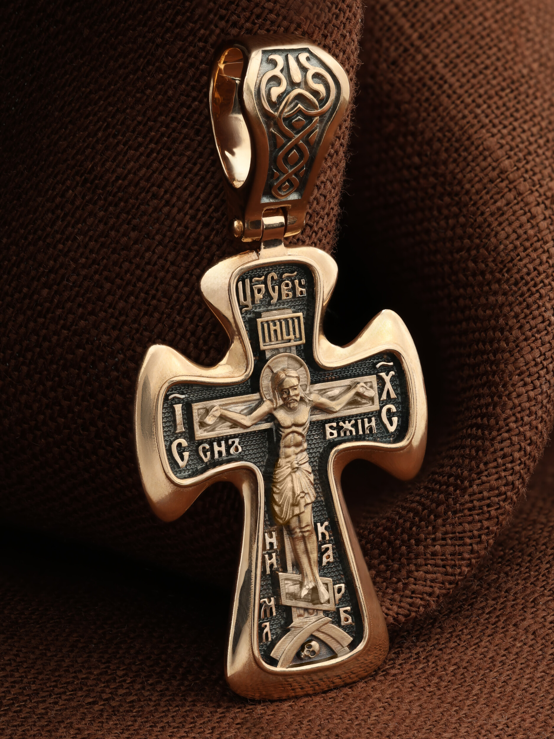 На лицевой стороне креста изображено Распятие Иисуса Христа. Господь представлен свободно покоящимся на кресте с простертыми руками и как бы обнимающим всю Вселенную. Он — Спаситель, искупивший грехи мира, «поправший смертию смерть» и призывающий к Себе «все концы земли». Поэтому рядом с Его образом помещены слова — «НИКА» и «Царь Славы». Эти слова характеризуют Господа как Великого Архиерея, победителя смерти. Также Распятие сопровождается надписями, олицетворяющими Христа. Это святое имя Христа «IC» (Иисус) «ХС» (Христос), и словосочетание «СЫН БОЖИЙ».
