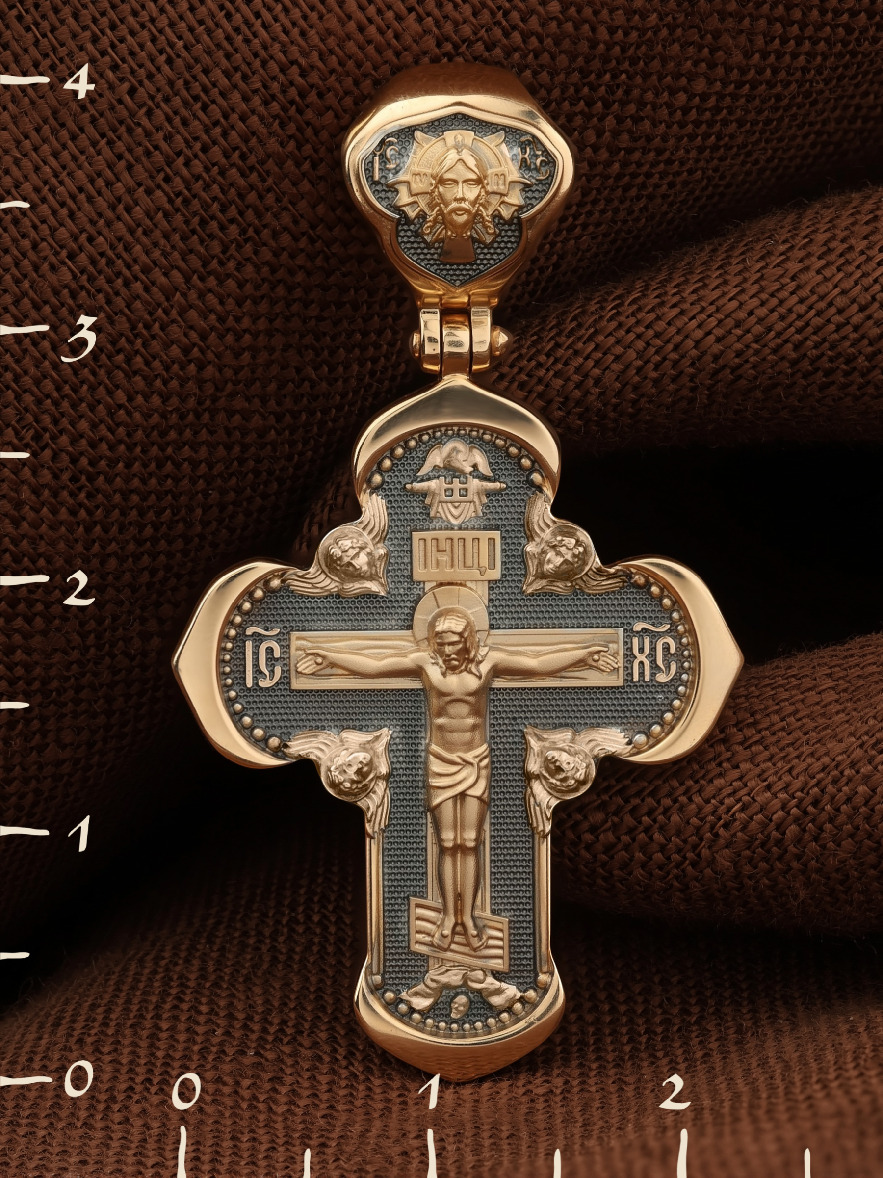 На лицевой стороне креста изображено Распятие Господа и Спасителя нашего Иисуса Христа, отдавшего Себя на смерть, для искупления грехов мира. Крест является символом жертвенной любви Всеблагого Бога к падшим людям, всепобеждающим духовным оружием христиан, основанием и средоточием церковной жизни. Господь сказал: «кто хочет идти за Мною, отвергнись себя, и возьми крест свой, и следуй за Мною». (Мк. 8: 34). На верхней табличке, выше головы Иисуса, расположена надпись, составленная Понтием Пилатом — «IНЦI». Она означает «Иисус Назорей, Царь Иудейский». Надпись «IC» «ХC», означает Иисус Христос, помещается на разных сторонах поперечной перекладины креста. Крест стоит на горе камней, символизирующих Голгофу. В ее основании различается череп– это голова Адама. На кулонном кольце изображен Нерукотворный образ Господа и Спасителя нашего Иисуса Христа, чудесно отпечатавшийся на плате, которым Христос вытер свой лик.
