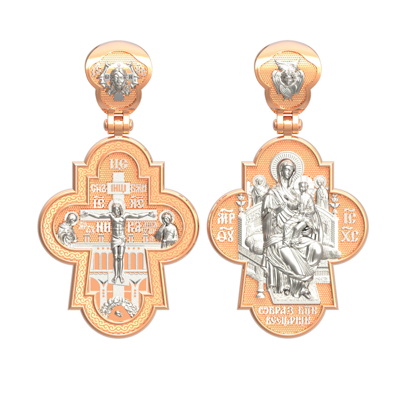 На оборотной стороне креста изображена икона Божией Матери «Всецарица» или «Пантанасса», на которой Пресвятая Богородица восседает на царском троне. На руках Ее — Богомладенец Христос со свитком в левой руке и благословляющий десницей. Правой рукой Богородица указывает на Своего Царственного Сына, как на Спасителя мира. Чудотворная икона была написана в XVII веке и находится на Святой Горе Афон, в одном из древних греческих монастырей — Ватопеде. По молитвам перед иконой совершается множество чудесных исцелений. Пречистая Богородица наставляет на праведный путь, помогает укрепить веру, найти утешение. На кулонном кольце изображен шестикрылый Серафим.