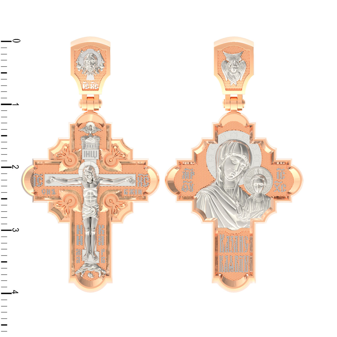 На оборотной стороне креста изображена Казанская икона Божией Матери. Пресвятая Богородица — милосердная заступница, просительница за нас перед Богом. Она стала воистину нашей Матушкой, охраняющей и поддерживающей нас от рождения до самой смерти, а Ее благодатная помощь изливается на нас по молитвам у ее чудотворных икон. Казанская икона явилась в 1579 году в Казани, вскоре после взятия Казанского царства у татар Иоанном Грозным. Этот образ Богородицы не раз сопровождал русский народ в бедствиях. Икона Божией Матери Казанская вдохновляла русских ратников в период Смутного времени при освобождении Москвы от поляков. Перед Казанской иконой в 1709 году, накануне Полтавской победы, император Петр I молился о даровании победы русскому войску. В 1812 году накануне отъезда в действующую армию перед чудотворной иконой Божией Матери молился князь Михаил Кутузов. Не только государственным мужам и дружинам указывала путь икона — по доброй традиции именно этой иконой благословляют на брак молодых родители, длинным списком чудес сопровождается этот образ Богоматери — один из самых любимых на Руси. Существует множество древних списков с этой удивительной иконы.