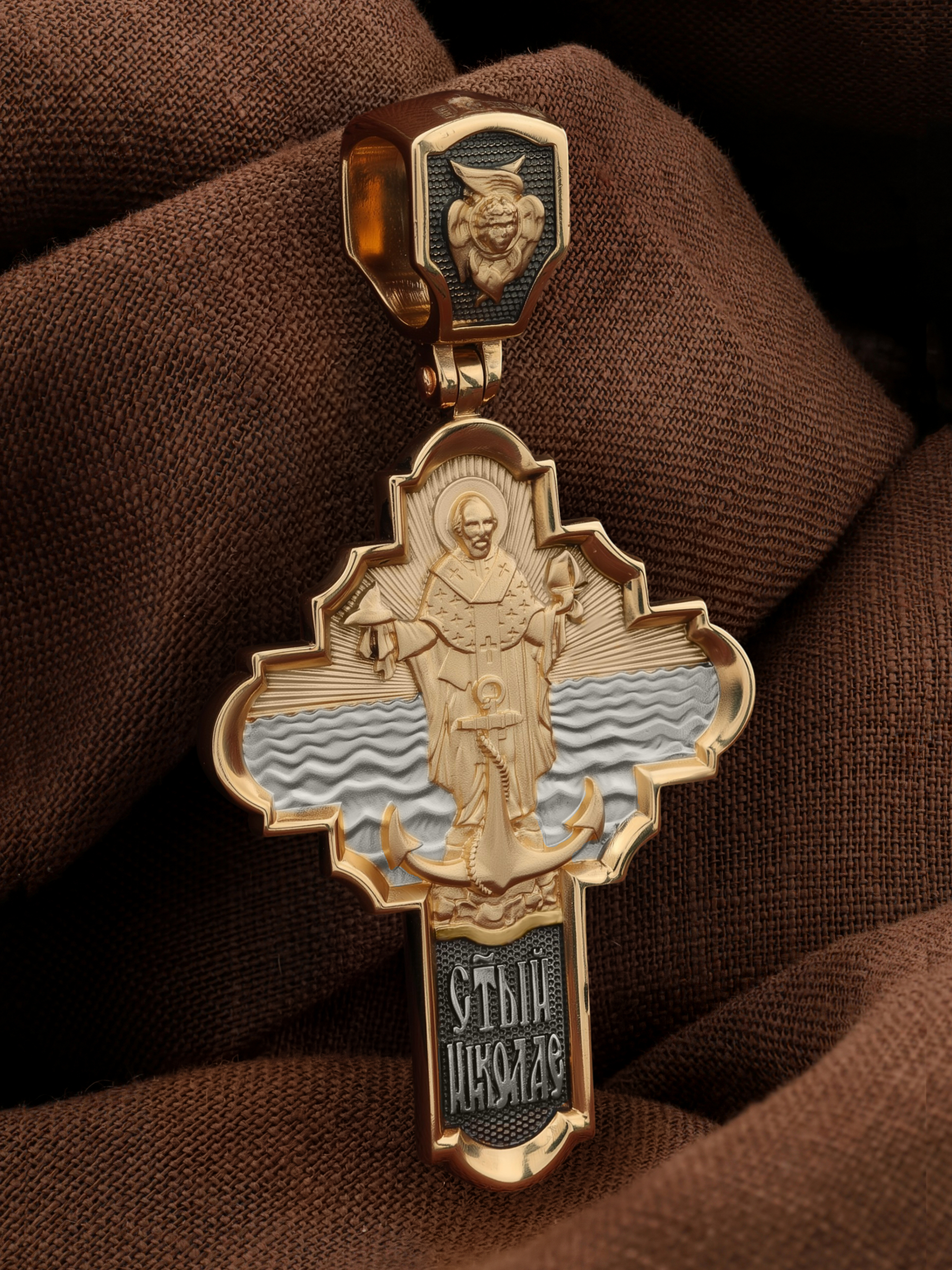 На оборотной стороне креста изображен Святитель Николай архиепископ Мир Ликийских, Чудотворец. Он является одним из самых почитаемых святых в православном мире. Много великих и преславных чудес сотворил на земле и на море великий Святитель Николай Угодник. Он помогал сущим в бедах, укрощал штормы, спасал от потопления и выносил на сушу из глубины морской, освобождал из плена и приносил освобожденных домой, избавлял от уз и темницы, защищал от посечения мечом, освобождал от смерти и подавал многим различные исцеления, слепым прозрение, хромым хождение, глухим слух, немым дар слова. Святитель Николай Чудотворец изображен стоящим в полный рост в лодке. В деснице святой держит мыс Горн, а в левой — корабль. Эта икона была написана путешественником и священником Фёдором Конюховым. Во время одного из своих путешествий, проходя пролив Дрейка, Фёдор, понимая, что выжить в такой бушующей стихии невозможно, стал молиться Святителю Николаю Чудотворцу. Он мысленно пообещал себе: «если пройду мыс Горн, то построю часовню Николаю Чудотворцу»… И в следующий миг, совсем неожиданно — волны утихли. Яхта Конюхова благополучно прошла опасный участок пути. Вернувшись домой, Фёдор Конюхов построил часовню в благодарность за свое спасение.