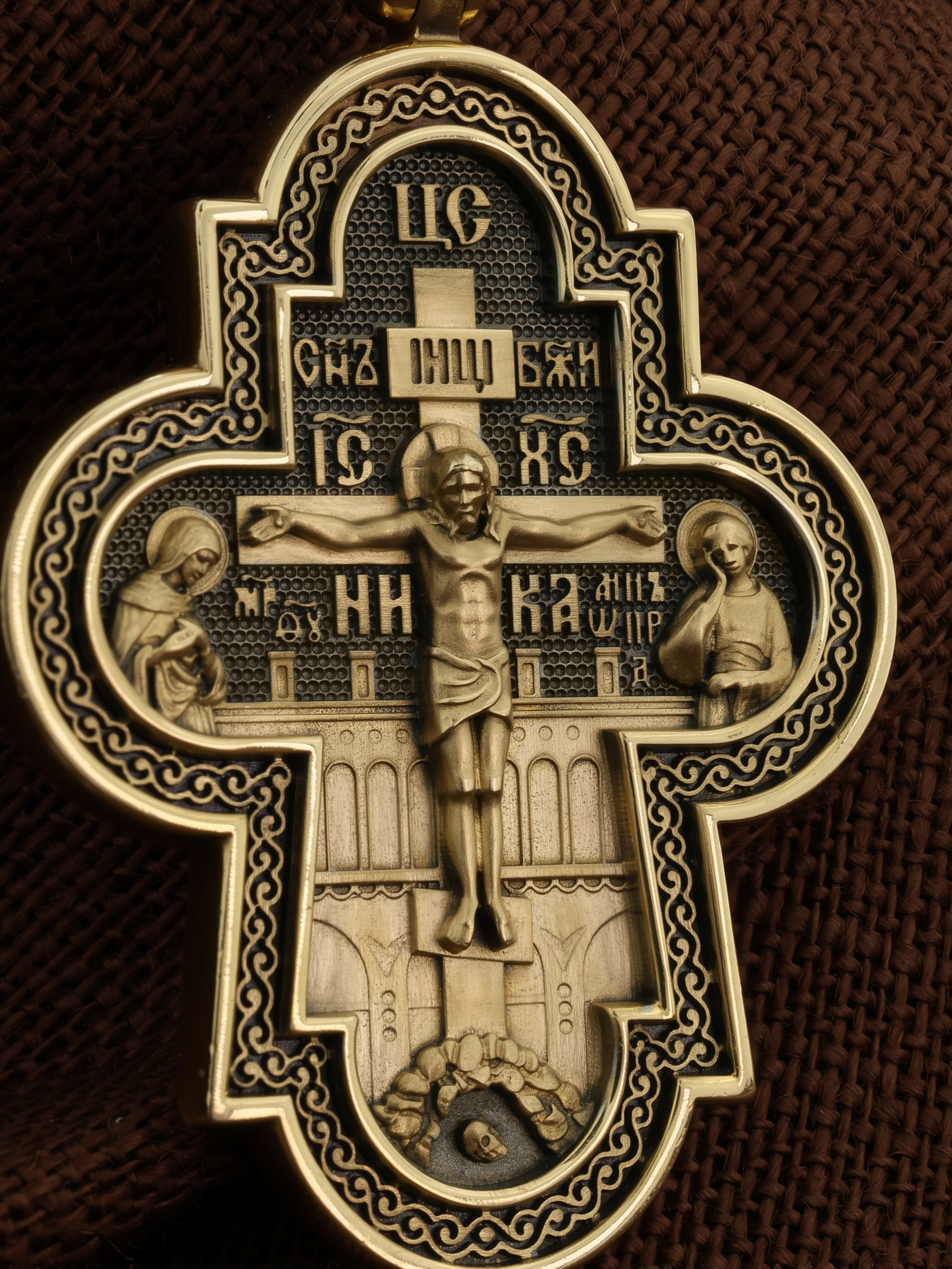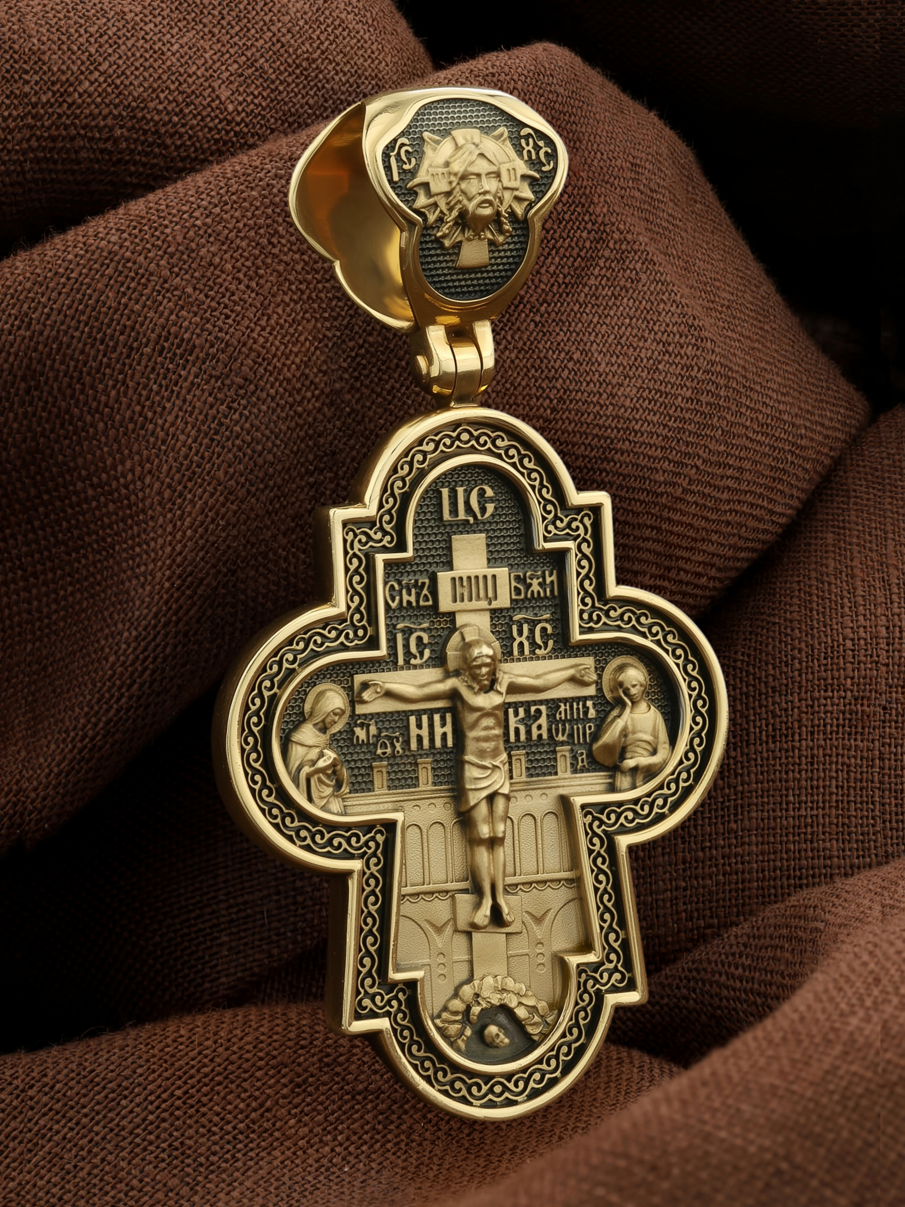 На лицевой стороне креста изображено Распятие Господа и Спасителя нашего Иисуса Христа, отдавшего Себя на смерть, чтобы другие могли жить — жить вечной жизнью, жить с Богом. Через крестную жертву Бог раскрывает нам Свою безмерную любовь и призывает к ответной любви. Своею кровью Господь освятил крест и сделал его проводником Своей благодати, источником освящения верующих. На верхней табличке, выше головы Иисуса, расположена надпись, составленная Понтием Пилатом — «IНЦI». Она означает «Иисус Назорей, Царь Иудейский». Распятие сопровождается каноническими надписями. Над Распятием находится надпись «Царь Славы». Надпись «IС» « ХС» означает Иисус Христос и помещается на разных сторонах поперечной (большой) перекладины креста. Рядом расположены надпись «Сын Божий» и слово «НИКА», что означает «победитель». Слева от Распятия изображена Пресвятая Богородица, справа — апостол и евангелист Иоанн Богослов, один из ближайших учеников Иисуса Христа. За Распятием высится Иерусалимская стена, в знак того, что Господь был распят вне стен города. Возвышение, на котором стоит Крест, символизирует гору Голгофу, на которой произошло Распятие. Под подножием Креста изображена покоящаяся голова (череп) Адама. Над На кулонном кольце изображен Нерукотворный образ Господа и Спасителя нашего Иисуса Христа, чудесно отпечатавшийся на плате, котором Христос вытер свой лик.