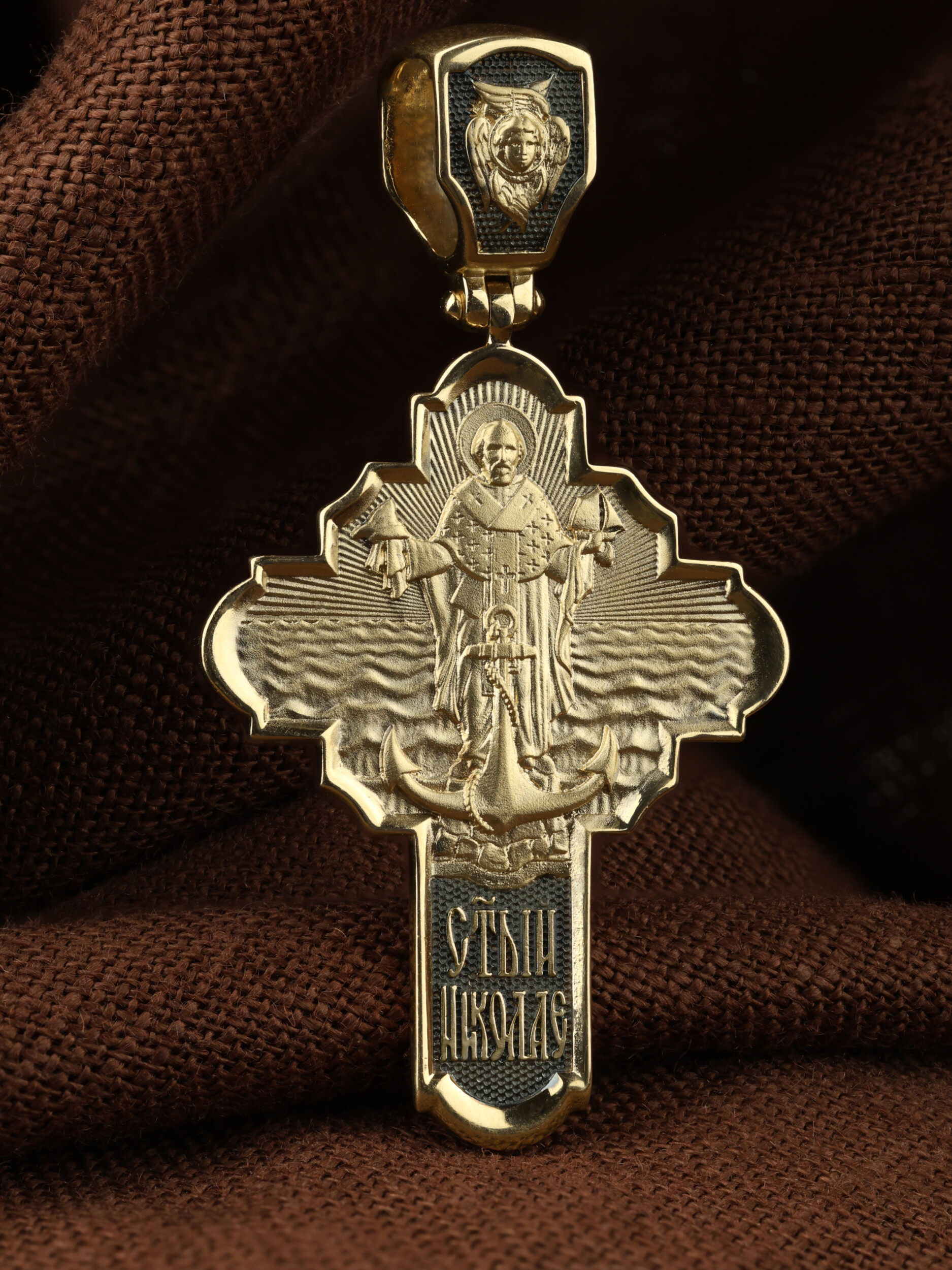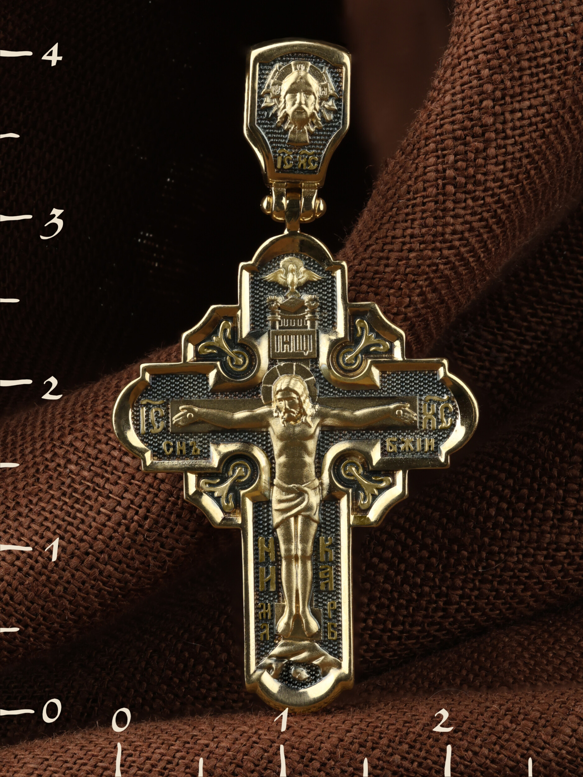 На лицевой стороне креста изображено Распятие Господа и Спасителя нашего Иисуса Христа, отдавшего Себя на смерть, чтобы другие могли жить — жить вечной жизнью, жить с Богом. Своею кровью Господь освятил крест и сделал его проводником Своей благодати, источником освящения верующих. На верхней табличке, выше головы Иисуса, расположена надпись, составленная Понтием Пилатом — «ИНЦИ». Она означает «Иисус Назорей, Царь Иудейский». Надпись «IС ХС» означает Иисус Христос помещается на разных сторонах поперечной (большой) перекладины креста. На кулонном кольце помещено изображение Духа Святого в виде голубя, сходящего с Небес