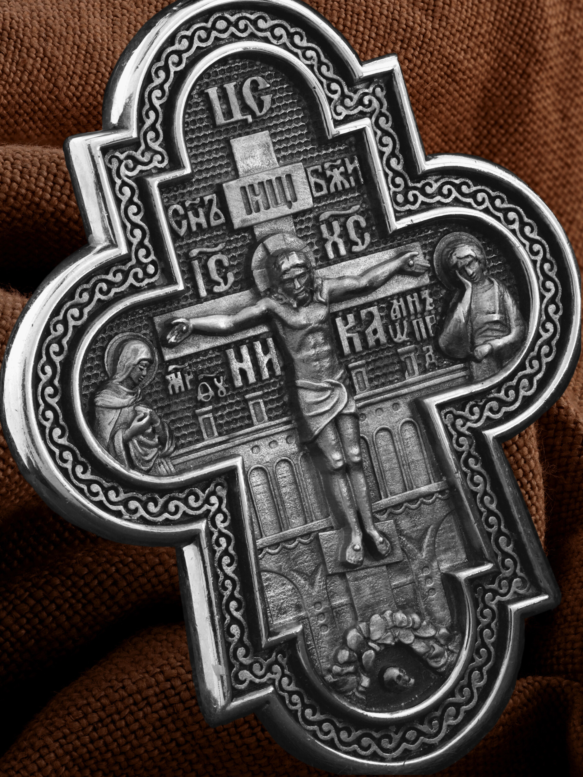 На лицевой стороне креста изображено Распятие Господа и Спасителя нашего Иисуса Христа, отдавшего Себя на смерть, для искупления грехов мира. Крест является символом жертвенной любви Всеблагого Бога к падшим людям, всепобеждающим духовным оружием христиан, основанием и средоточием церковной жизни. Господь сказал: кто хочет идти за Мною, отвергнись себя, и возьми крест свой, и следуй за Мною. (Мк. 8: 34). Над Распятием помещена надпись «Царь Славы». На верхней табличке, выше головы Иисуса, расположена надпись, составленная Понтием Пилатом — «IНЦI». Она означает «Иисус Назорей, Царь Иудейский». Надпись «IC» «ХC», означает Иисус Христос, помещается на разных сторонах поперечной перекладины креста. Возвышение, на котором стоит Крест, символизирует гору Голгофу, на которой произошло Распятие. Под подножием Креста изображена покоящаяся голова (череп) Адама. На кулонном кольце изображен Нерукотворный образ Господа и Спасителя нашего Иисуса Христа, чудесно отпечатавшийся на плате, которым Христос вытер свой лик.