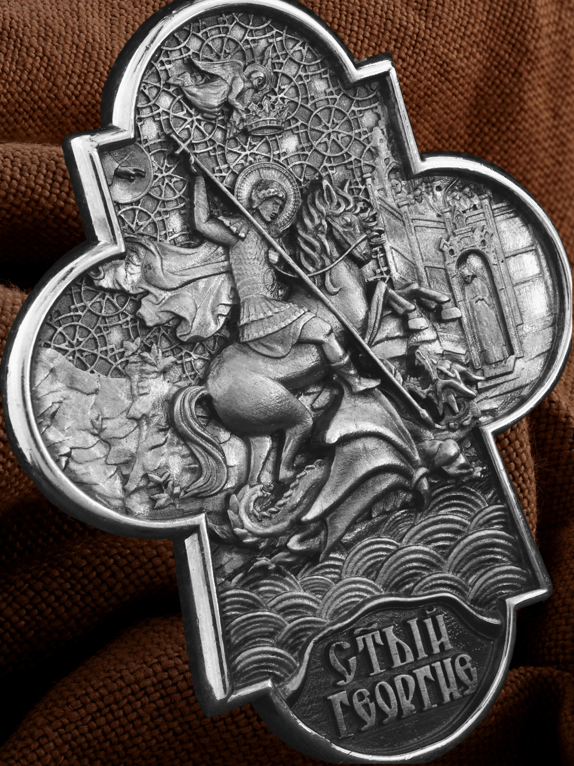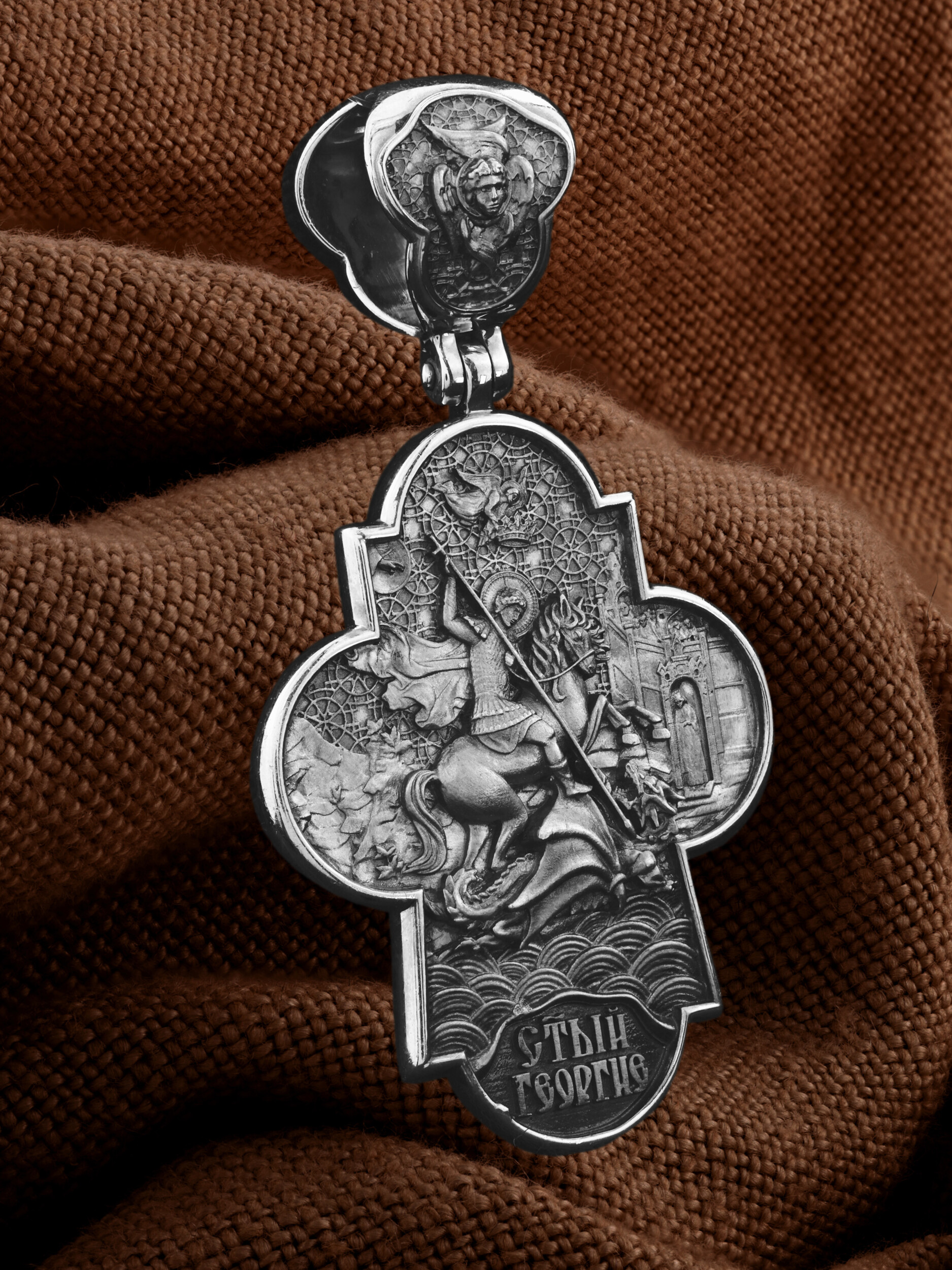 На оборотной стороне креста помещено изображение Святого Великомученика Георгия Победоносца — одного из самых почитаемых и удивительных святых. Георгий родился в Каппадокии (Малая Азия) в семье богатых и знатных горожан. Юношей поступил на службу к римскому императору Диоклетиану, за отличное знание военного дела и проявленную в боях и походах храбрость был приближен к императору и удостоен высокого воинского звания. Во время начавшихся гонений на христиан, перешел на сторону гонимых и, отвергнув человеческий страх, стал ярым проповедником учения Христа. Мучители подвергли опального воеводу жесточайшим восьмидневным пыткам и казнили его (обезглавили) в возрасте около тридцати лет в 303 году. Георгий изображен как воитель, сидящий на вздыбленном коне и поражающий копьем огнедышащего змея. Слева над образом изображена благословляющая Божия десница. Над святым изображен ангел возлагающий на него венец мученика. Змей символизирует собою сатанинские силы. Молитвами вознесенными к Всевышнему и своей непреклонной верой он смог одолеть чудовище. Святой убил змея, спас царскую дочь, принесенную в жертву, и жителей города, их души от влияния дьявола, породив в них надежду и веру в Господа, призывая людей принять христианскую веру. На кулонном кольце изображен шестикрылый Ангел — Серафим.