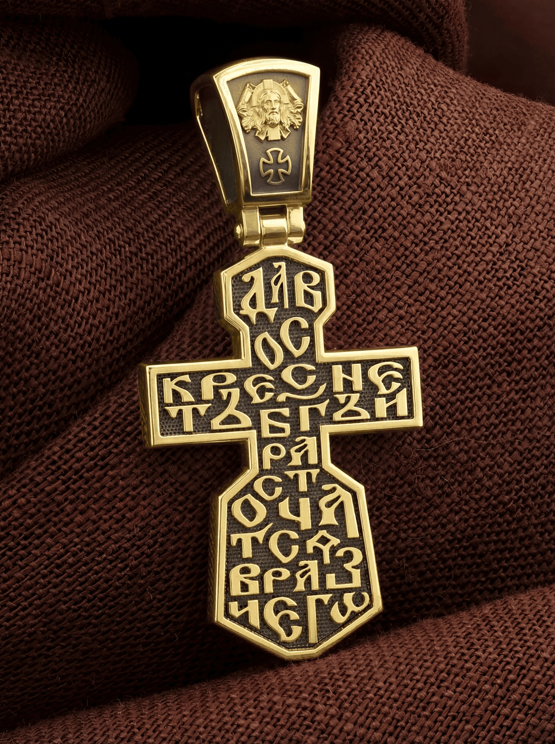Всю оборотную часть креста занимает начальный стих оградительной молитвы Честному Кресту Господню: «Да воскреснет Бог, и расточатся врази Его».