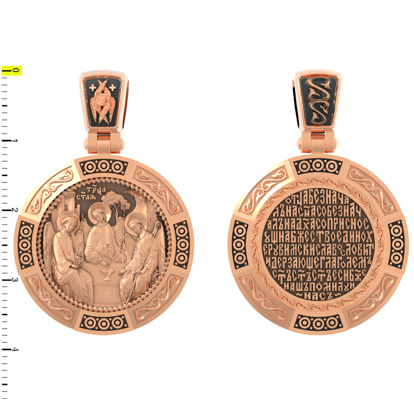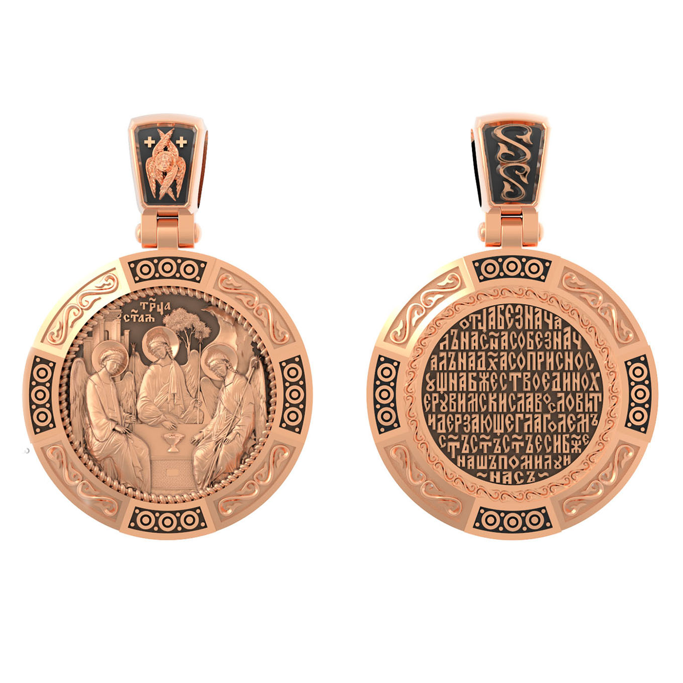 На лицевой стороне изображена икона Святой Троицы. Это образ Триединого Бога явившегося в виде трех Ангелов праотцу Аврааму. Ангелы сидят за трапезным столом вокруг чаши, которая символизирует грядущую жертву Второго Лица Пресвятой Троицы, Бога Сына.