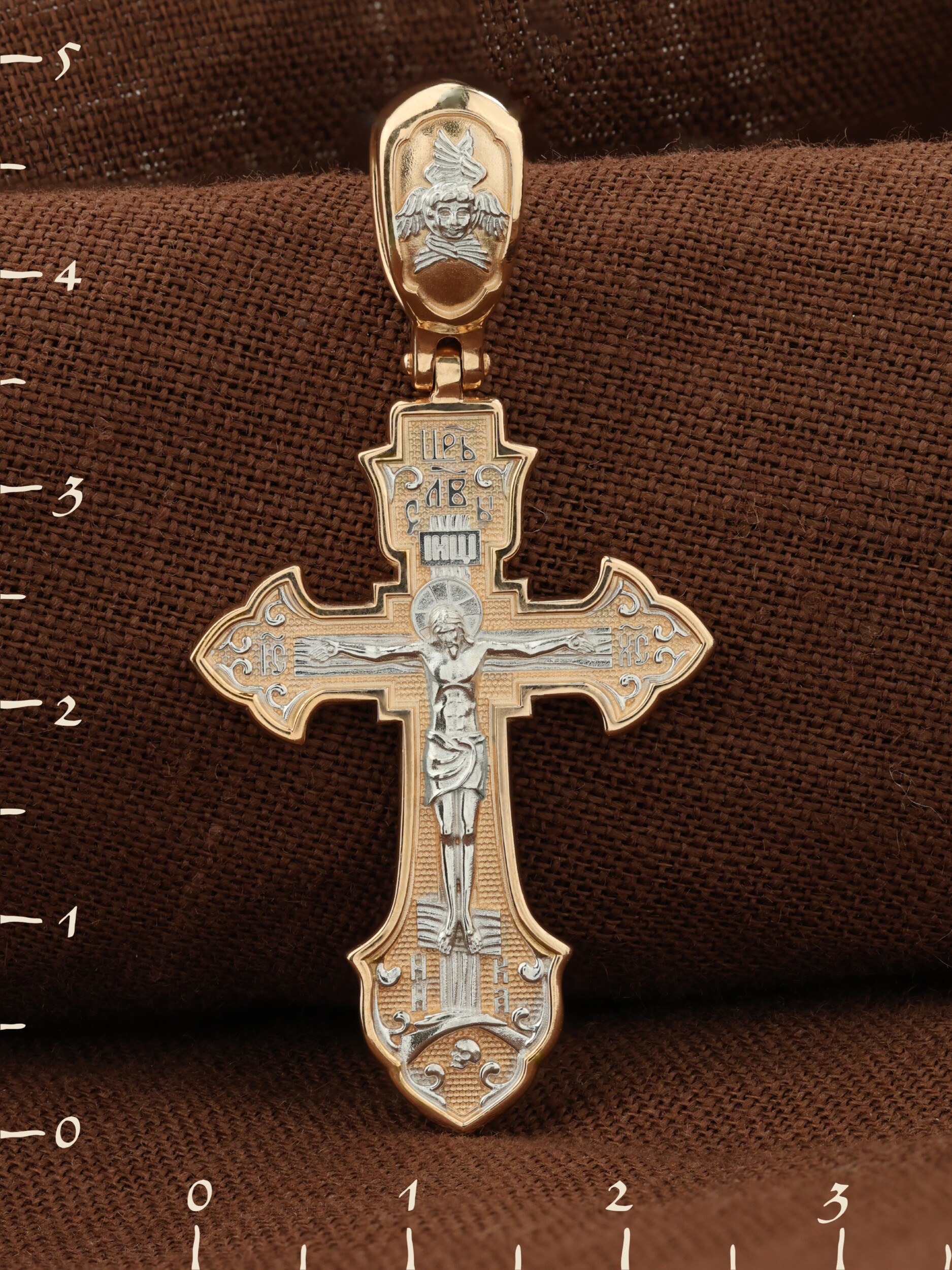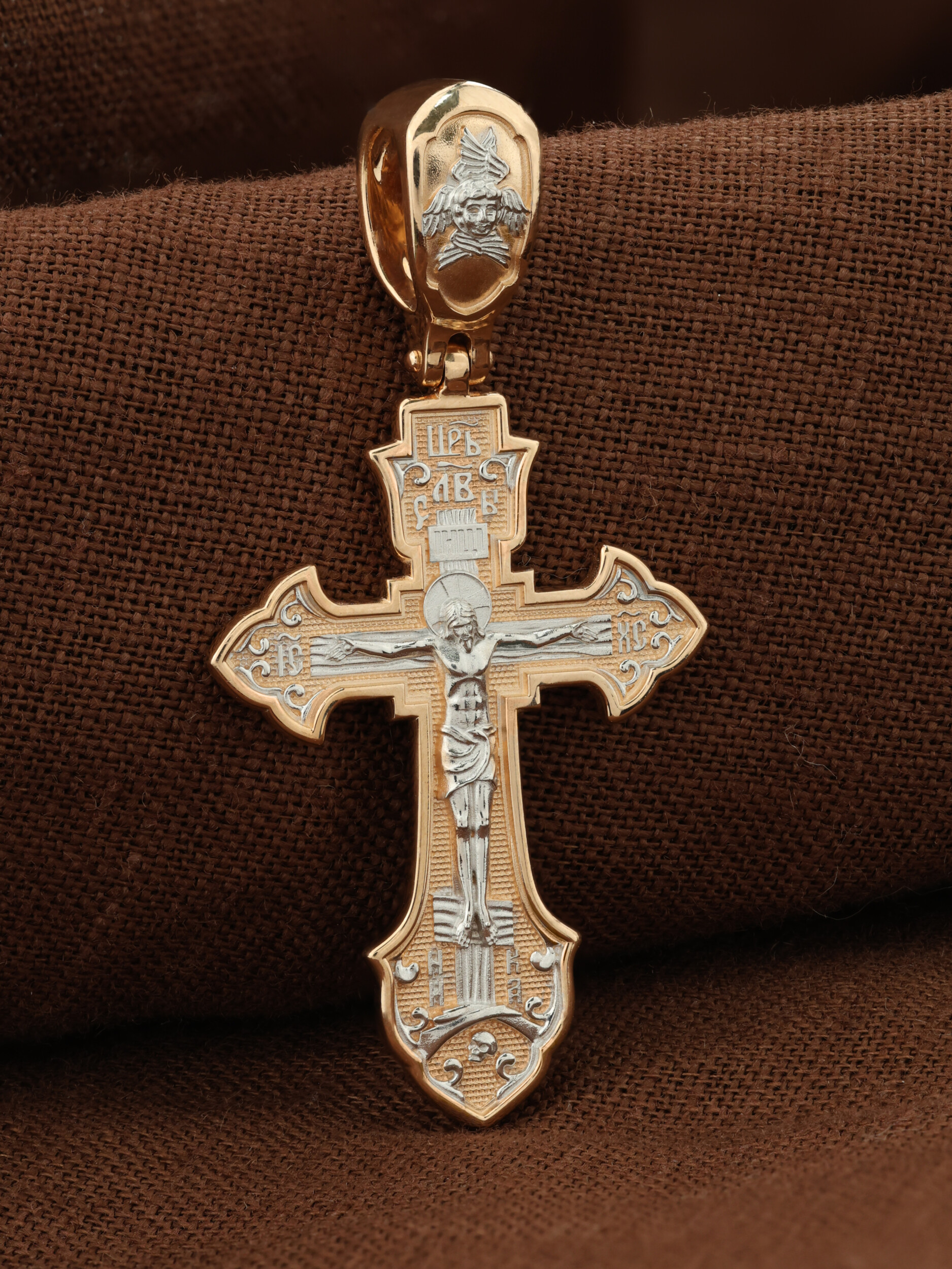 На лицевой стороне этого креста центральную часть занимает икона Распятия Христа — образ жертвы, принесенной Господом за грехи людей. Именно ко Христу, сошедшему на землю ради нашего спасения, возносятся все молитвы. Рядом с Его образом помещены слова — «НИКА» и «Царь Славы». Эти слова характеризуют Господа как Великого Архиерея, победителя смерти. Также Распятие сопровождается надписями, олицетворяющими Христа — это святое имя Христа «IC» (Иисус) «ХС» (Христос). Венчает лицевую сторону креста надпись «Царь Славы». На кулонном кольце помещено изображение Спаса Нерукотворного.