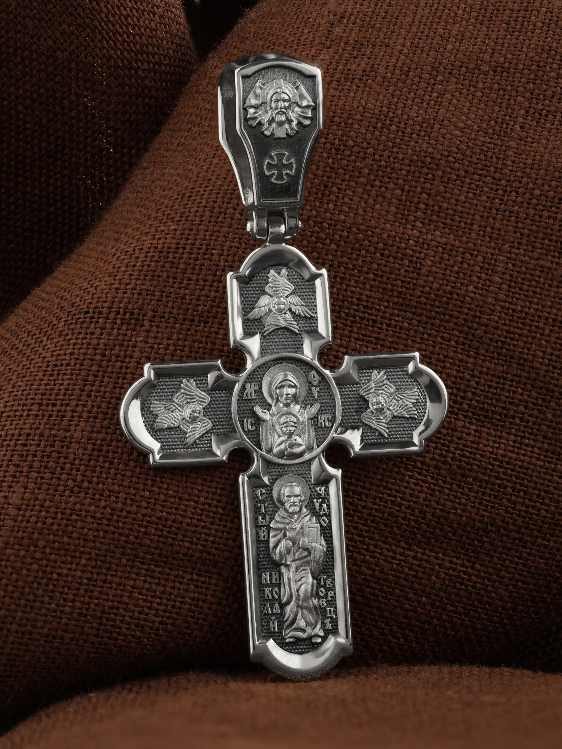 У основания креста в полный рост изображен самый любимый святой Православной Церкви — Николай Чудотворец. Святой почитается как целитель болезней, покровитель путешествующих, особенно по морю, помощник в торговле, учебе, а также в поисках достойного супруга.