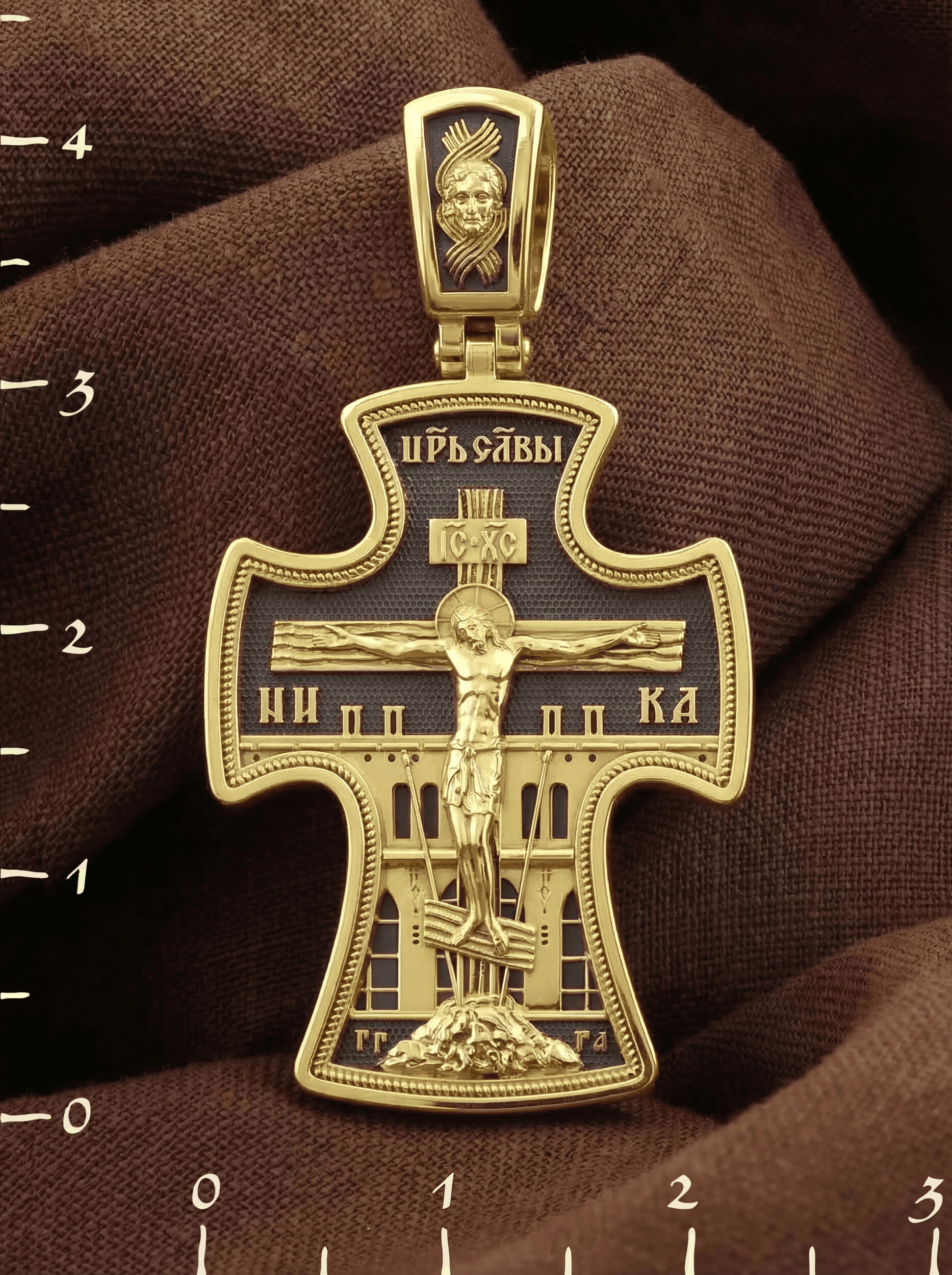 На лицевой стороне креста изображено Распятие, потому что это орудие казни Иисус Христос сделал орудием победы над грехом и смертью. Своими страданиями Он искупил грехи человечества, умерев и сошествовав во ад, победил сатану, освободил души праведников от вечной смерти и открыл им небесные врата рая. Жертва Христа сделала возможным спасение для каждого человека. На православном кресте Христос не умирает, а свободно простирает руки, ладони Иисуса открыты, будто он хочет обнять все человечество, даря им свою любовь и открывая путь к вечной жизни. Над титлом видим слова «ЦРЬ СЛВЫ» — Царь Славы. Верхняя перекладина символизирует собой табличку с надписью «IC XC» — Иисус Христос, ниже перекладины добавляется: «НИКА» (греч. — Победитель). Возвышение, на котором стоит Крест, символизирует гору Голгофу, на которой произошло Распятие. У подножия Креста изображают прах Адама, обозначенный черепом. По сторонам Голгофы начертаны буквы «ГГ» (Гора Голгофа) и «ГА» (голова Адама). Справа и слева от Креста изображены орудия страданий Господа — трость и копие, обозначенные буквами «Т» и «К».