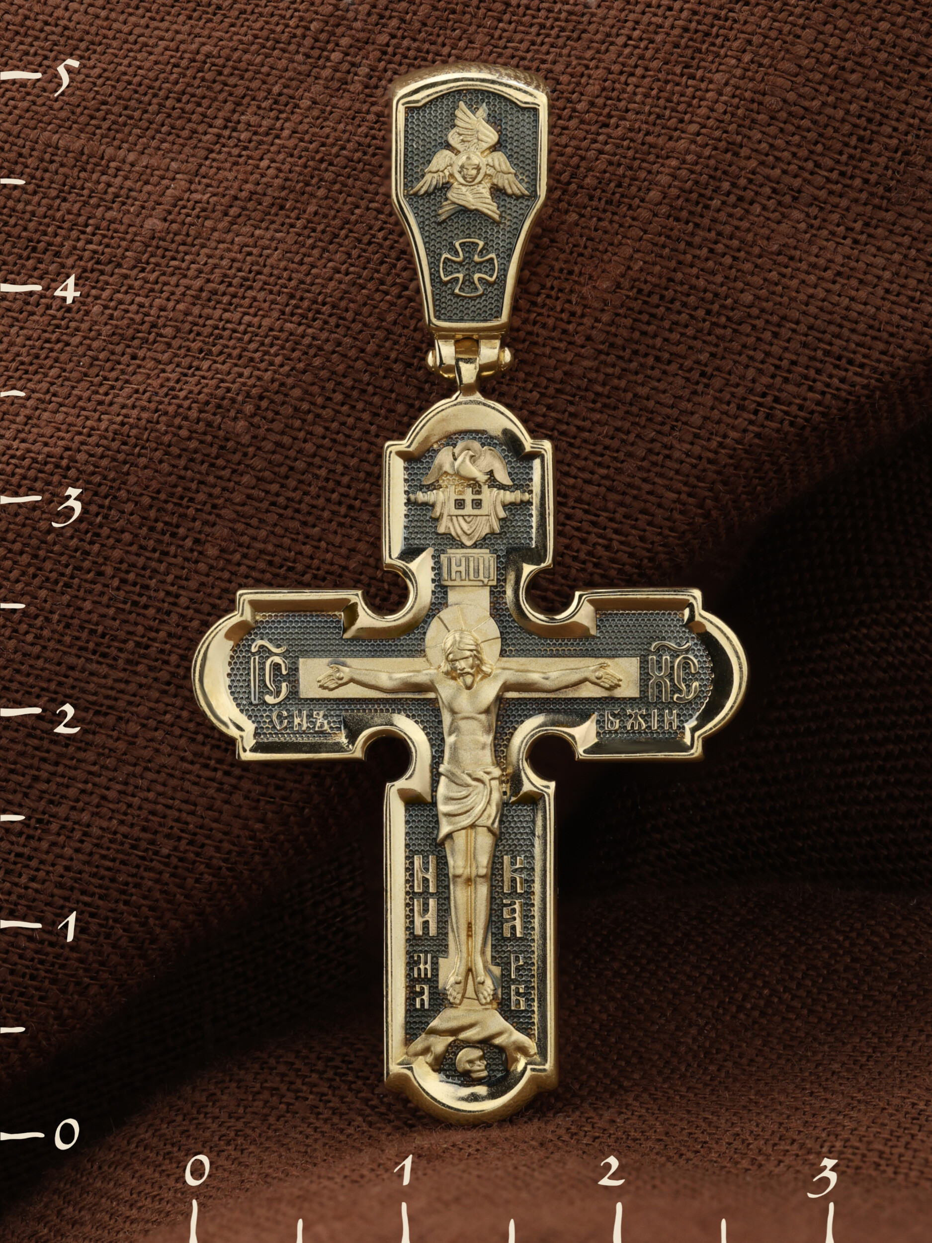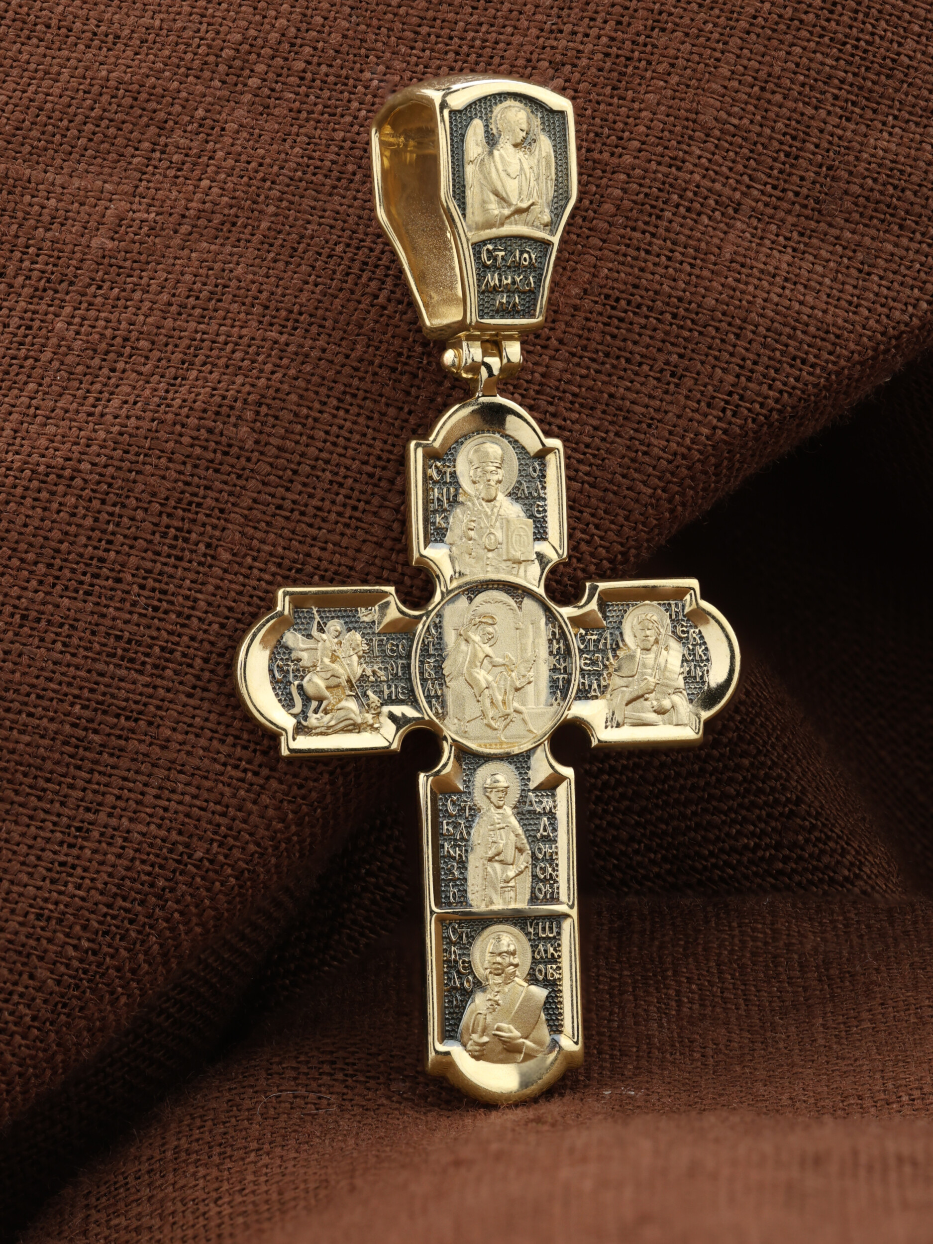 На лицевой стороне креста изображено Распятие Господа и Спасителя нашего Иисуса Христа. Христос, подвергнутый на кресте мучительной казни, своими страданиями искупил нас от древнего греха и даровал нам жизнь вечную. Без Распятия не было бы Воскресения Христова, и поэтому Крест из орудия казни обратился в святыню, в которой действует Благодать Божия. Над Распятием изображен Дух Святой в виде голубя, сходящего с Небес. Распятие сопровождается каноническими надписями. На верхней табличке, выше головы Иисуса, расположена надпись, составленная Понтием Пилатом на трех языках — «IНЦI». Она означает «Иисус Назорей, Царь Иудейский». Надпись «IС ХС» означает Иисус Христос и помещается на разных сторонах поперечной (большой) перекладины креста. Ниже — словосочетание «СЫН БОЖИЙ», что означает божественную природу Иисуса Христа. Крест стоит на горе камней, символизирующих Голгофу. В ее основании различается череп — это голова Адама. Надписи «Ника», что означает Победитель, и надпись «МЛРБ» — «место лобное рай бысть», что означает место лобное стало раем, размещены в нижней части креста. На кулонном кольце изображен шестикрылый Серафим.
