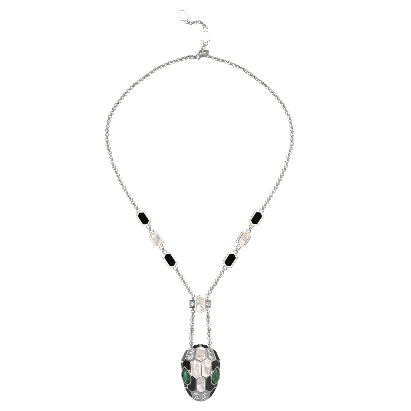 Колье из белого золота c бриллиантами, рубином, ониксом, малахитом и перламутром