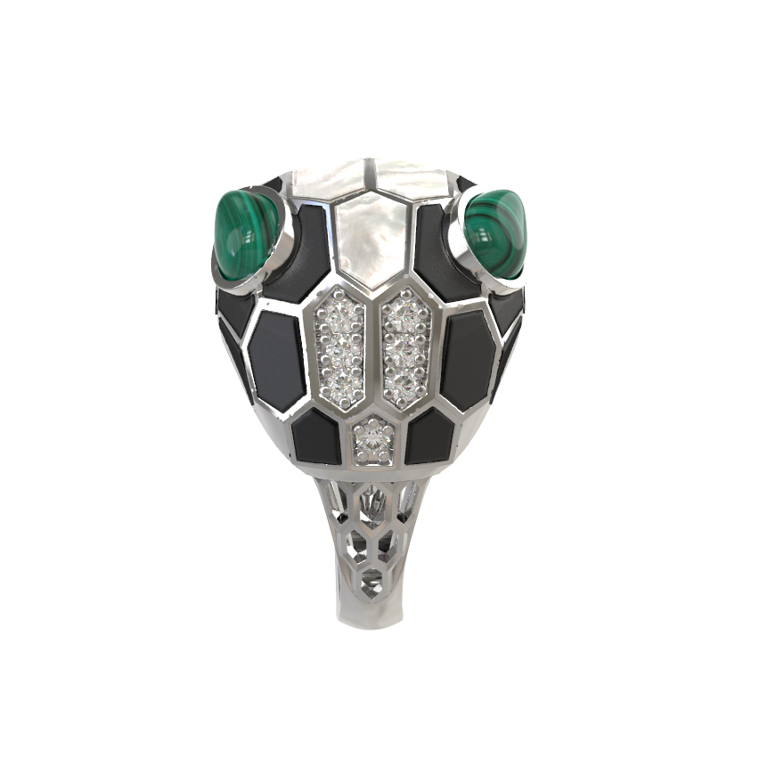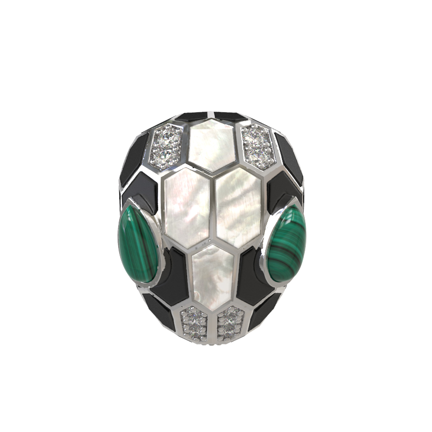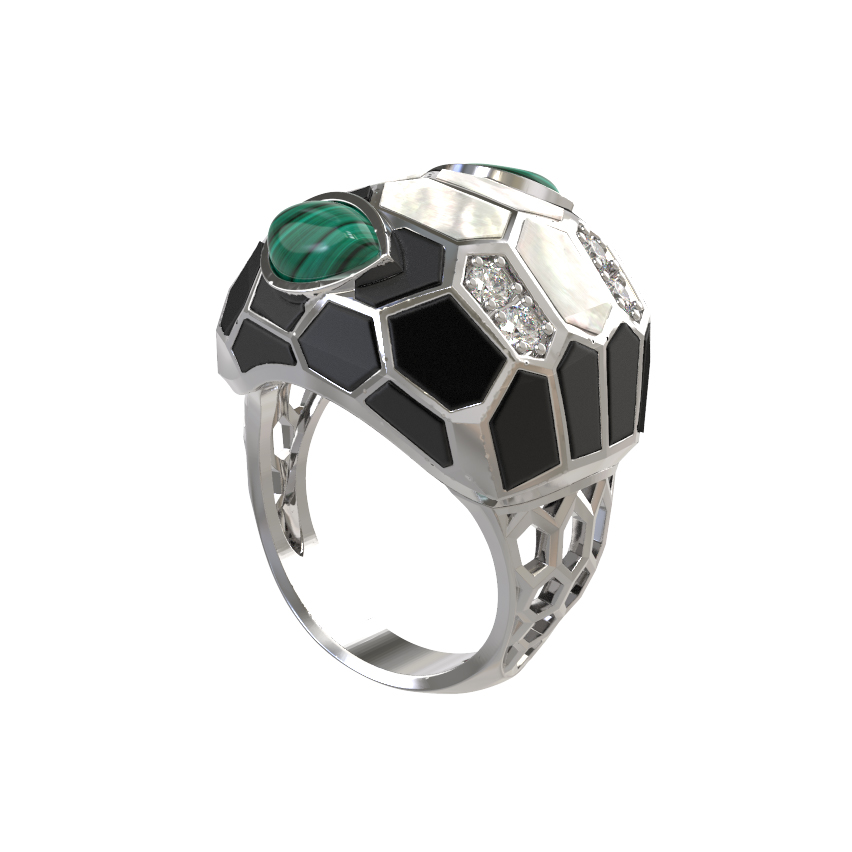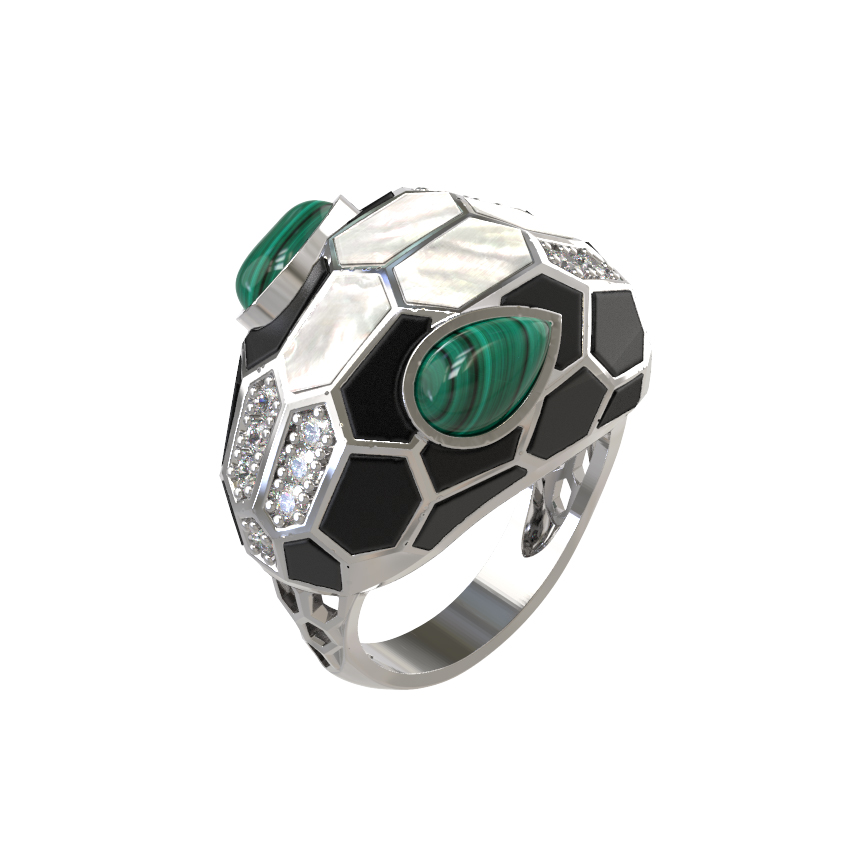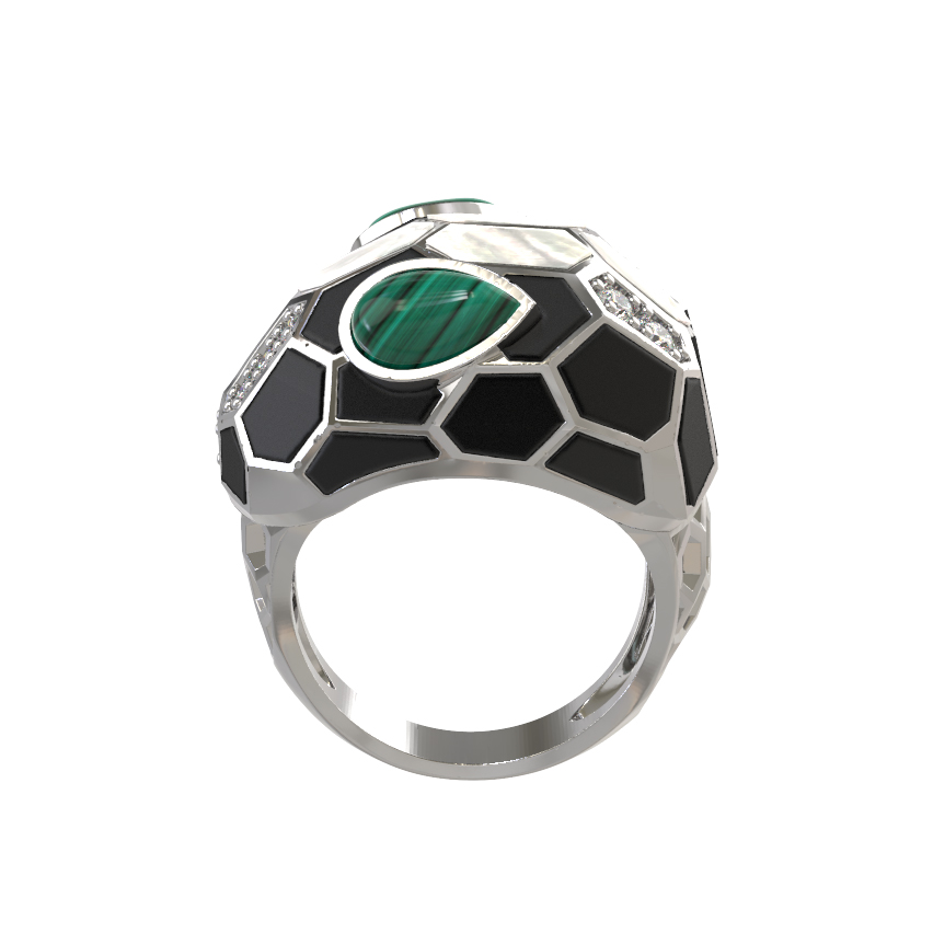 Кольцо из белого золота c бриллиантами, рубином, ониксом, малахитом и перламутром