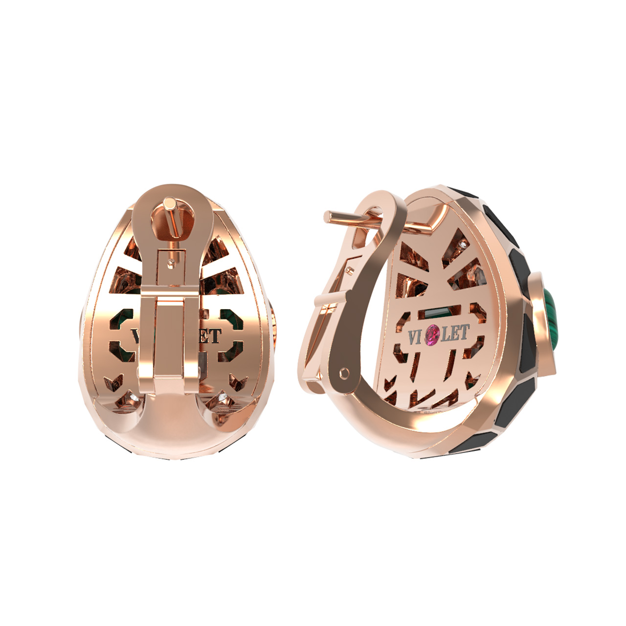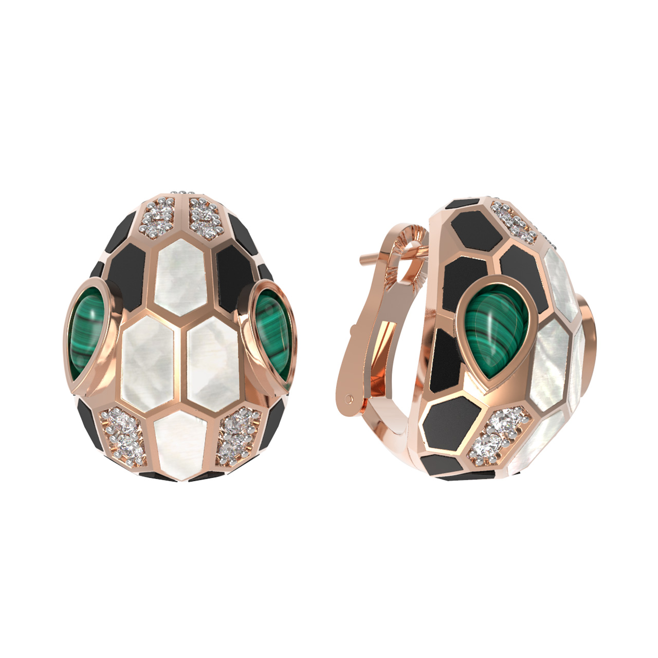 Серьги из золота c бриллиантами, рубином, ониксом, малахитом и перламутром