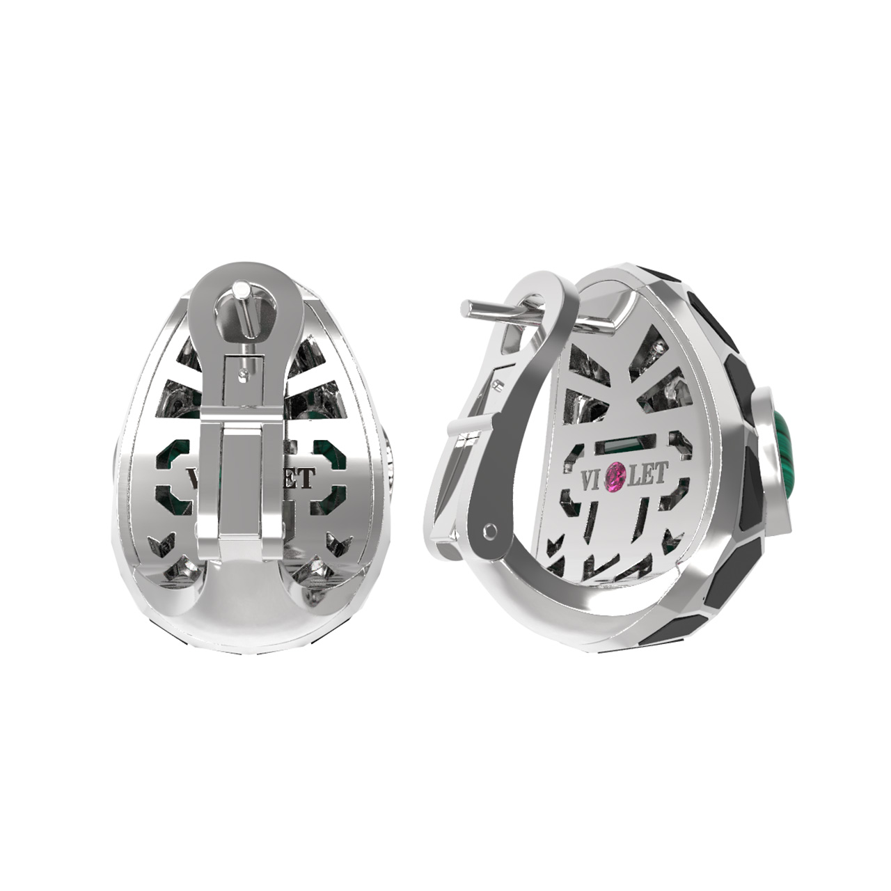 Серьги из белого золота c бриллиантами, рубином, ониксом, малахитом и перламутром
