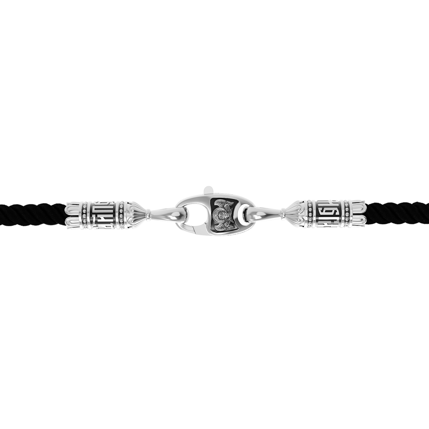 На концах цепи-шнурка расположены концевики с надписью: «Спаси и сохрани». Соединяет концевики замочек-карабин в форме рыбки. На замочке изображен шестикрылый Серафим.