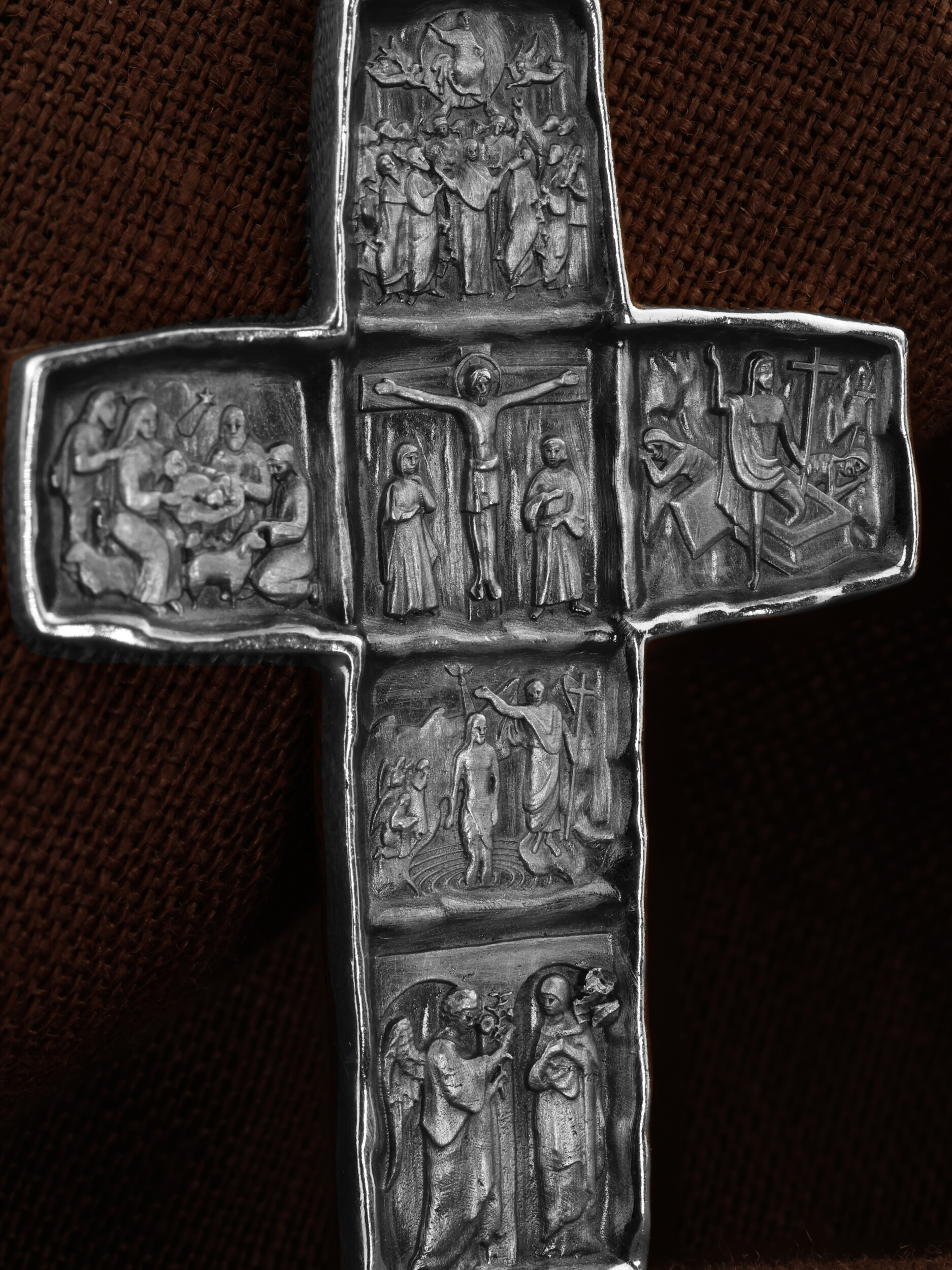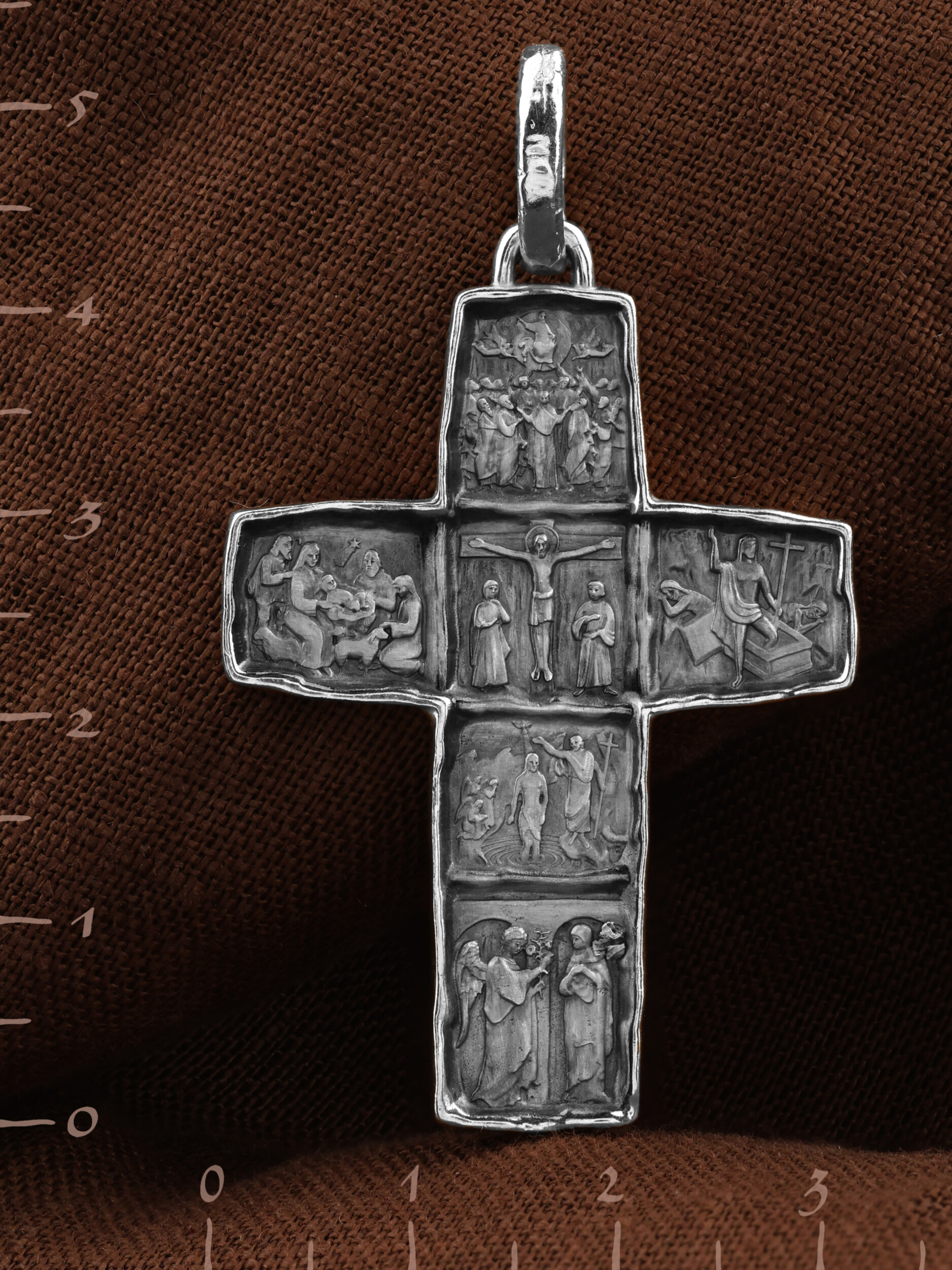 На лицевой стороне креста изображены основные события земной жизни, Крестные Страдания, Воскресение и Вознесение Господа и Спасителя нашего Иисуса Христа. Крест — символ спасения и искупления рода человеческого, знамение победы над смертью и адом. Иисус Христос, как искупительная жертва освобождения человечества от власти греха, умер крестной смертью и в третий день воскрес. В центре креста изображено Распятие Иисуса Христа на Кресте. Ниже Распятия размещено изображение Благовещения Пресвятой Богородицы, а так же Крещение Господне. Слева от Распятия изображено Рождество Господне, справа отображен образ Воскресшего из гроба Господа и Спасителя нашего Иисуса Христа. Над Распятием изображено Вознесение Господне.