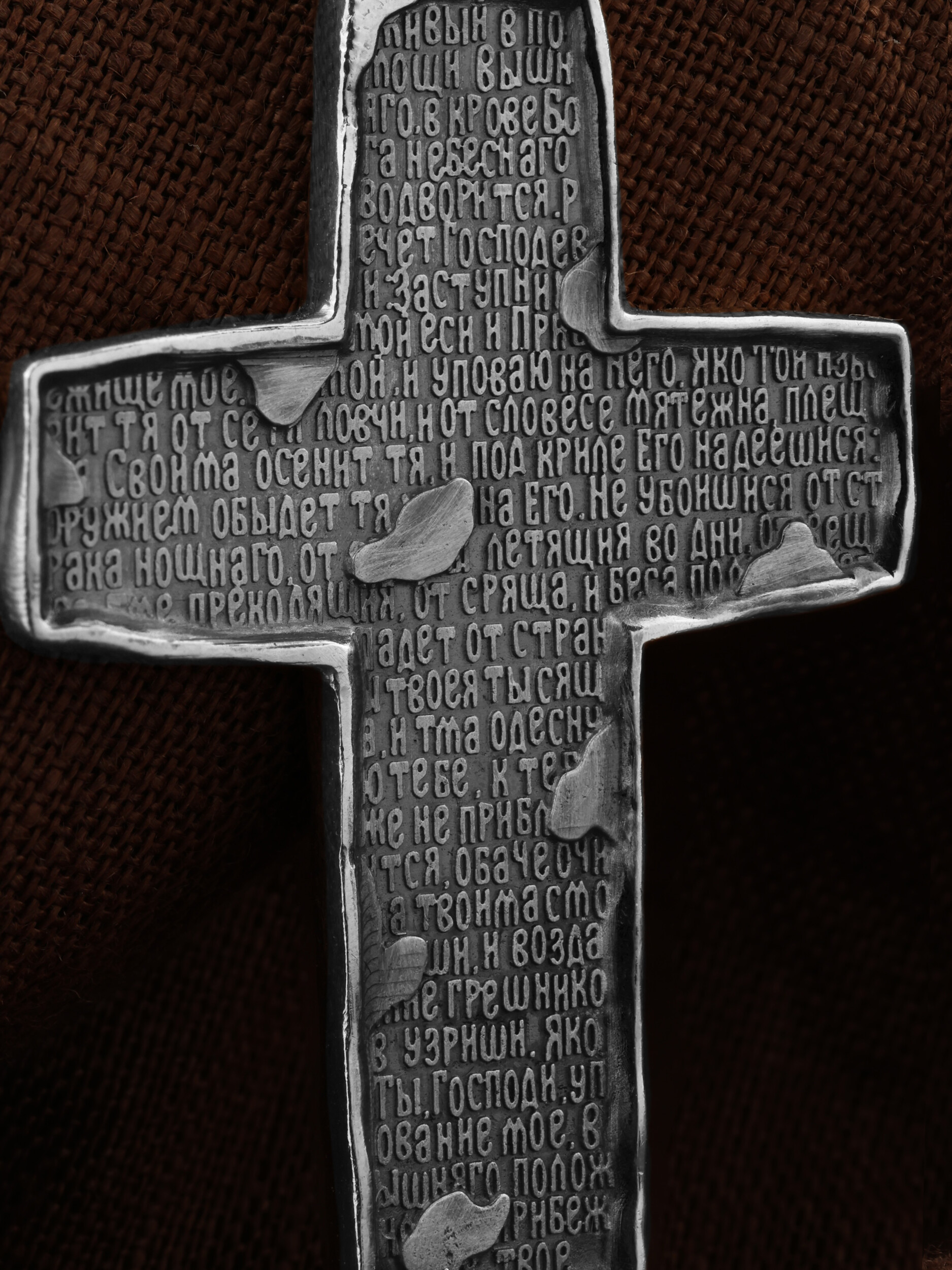 На оборотной стороне креста размещена часть 90 псалма царя Давида: «Живый в помощи Вышняго, в крове Бога Небеснаго водворится. Речет Господеви: Заступник мой еси и Прибежище мое, Бог мой, и уповаю на Него. Яко Той избавит тя от сети ловчи, и от словесе мятежна, плещма Своима осенит тя, и под криле Его надеешися: оружием обыдет тя истина Его. Не убоишися от страха нощнаго, от стрелы летящия во дни, от вещи во тме преходящия, от сряща, и беса полуденнаго. Падет от страны твоея тысяща, и тма одесную тебе, к тебе же не приближится, обаче очима твоима смотриши, и воздаяние грешников узриши. Яко Ты, Господи, упование мое, Вышняго положил еси прибежище твое. Не приидет к тебе зло, и рана не приближится телеси твоему, яко Ангелом Своим заповесть о тебе, сохранити тя во всех путех твоих. На руках возмут тя, да не когда преткнеши о камень ногу твою, на аспида и василиска наступиши, и попереши льва и змия. Яко на Мя упова, и избавлю и: покрыю и, яко позна имя Мое. Воззовет ко Мне, и услышу его: с ним есмь в скорби, изму его, и прославлю его, долготою дней исполню его, и явлю ему спасение Мое.»