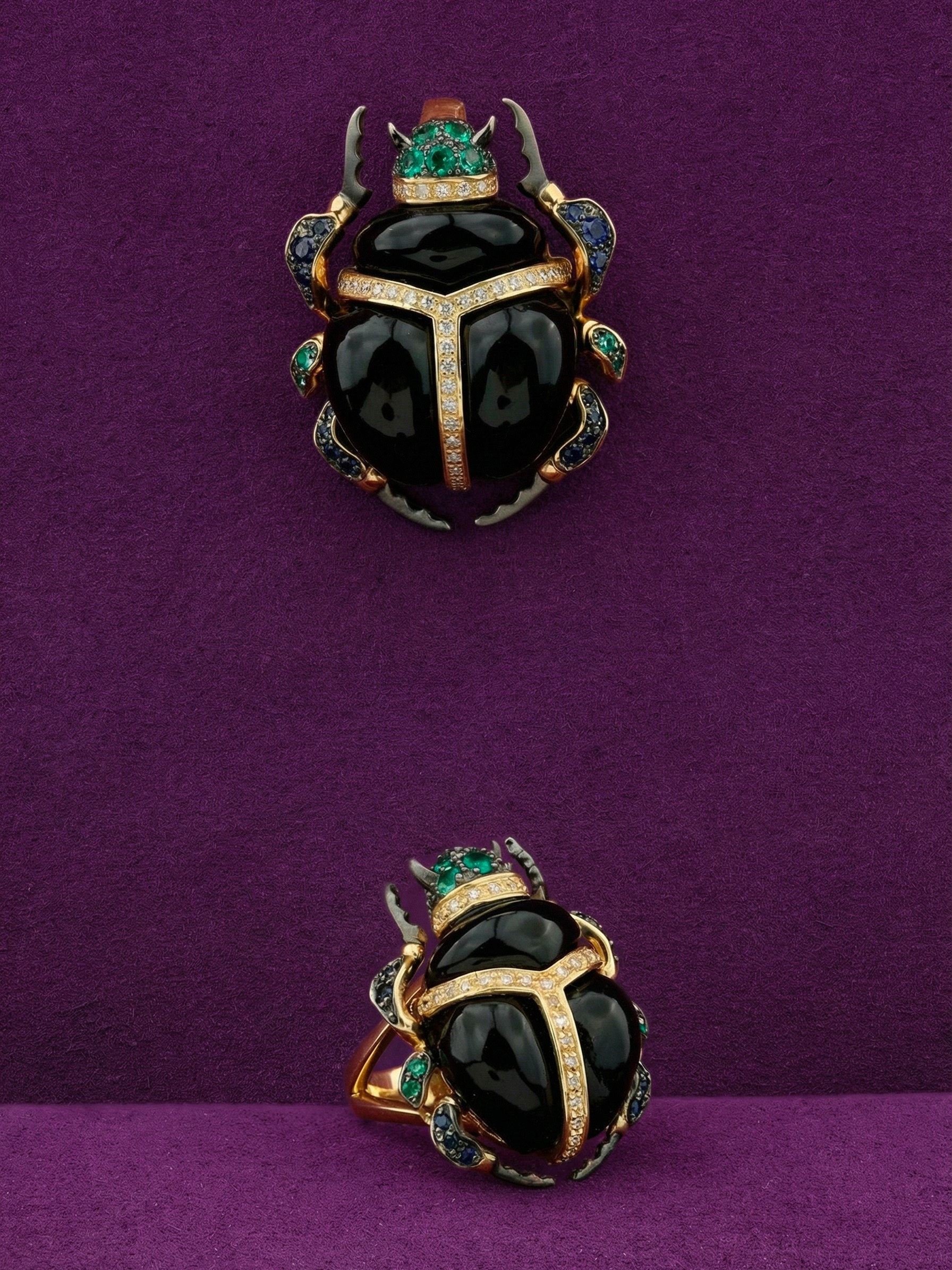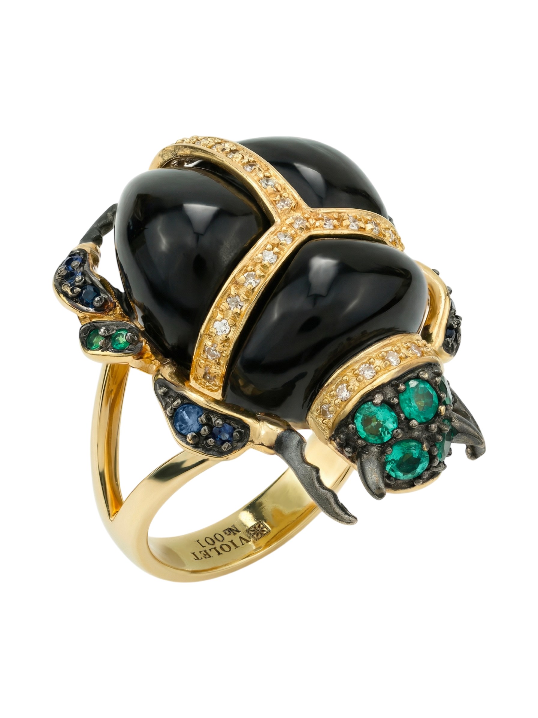 Кольцо из лимонного золота c бриллиантами, сапфиром, изумрудом и ониксом