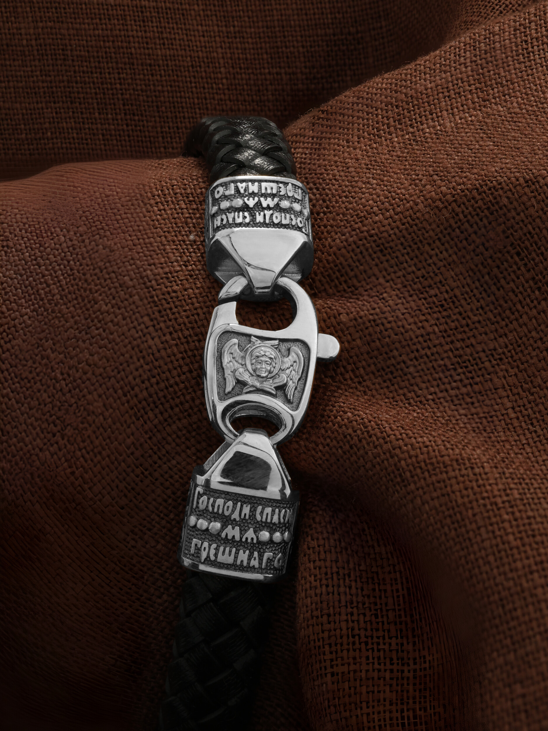Композиционным центром браслета является Иисус Христос в образе Вседержителя, по-гречески «Пантократор». Это древнейший образ Спасителя, на котором Он представлен как властелин и правитель мира. Христос держит в руках Книгу, которая символизирует Книгу Бытия, то есть весь сотворенный Богом мир. В этой Книге судьбы всех людей, живущих на земле. Слева от образа Вседержителя — икона Архангела Михаила — Архистратига всех Небесных Воинств. Он ведет непримиримую войну против сил зла, охраняет райские врата и защищает души людей. Его имя означает «Кто яко Бог?», так как он самый могучий и грозный враг зла. Он первым ополчился на Денницу, когда тот восстал против Бога, низверг его с Неба и не перестает сражаться с его темным воинством. Поэтому он часто изображается в виде воина, в доспехах и с огненным мечом. Справа от образа Вседержителя — Великомученик Георгий Победоносец. Образ Великомученика считают одним из наиболее чтимых святынь в Святыни Православных, он олицетворяет собой заступника для верующих, чья жизнь имеет какое-либо отношение к военным делам, также он может оберегать и землевладельцев. Одно из самых великих чудес которое сотворил Великомученик так это — спасения всего города от устрашающего змия. Молитвами и своей непреклонной верой, взываемой к Всевышнему, он смог одолеть чудовище. Святой убил змея, спас жителей и их души от влияния дьявола, породив в них надежду и веру в Господа, призывая людей принять христианскую веру. Поскольку при жизни Святой Георгий был военным, он считается покровителем всех, кто имеет отношение к армии — военнослужащим, участникам боевых действий. Молитва перед иконой Георгия Победоносца поможет защититься от врагов, одержать победу в сражении (военном, спортивном, духовной брани с дьяволом), содействие в установлении мир