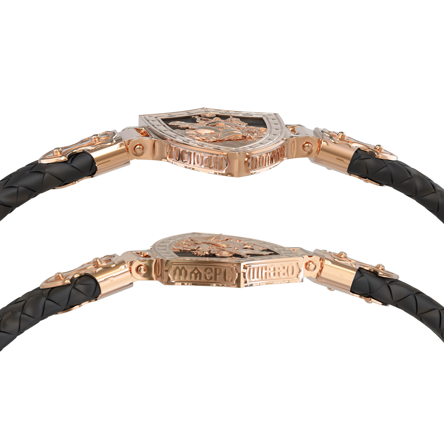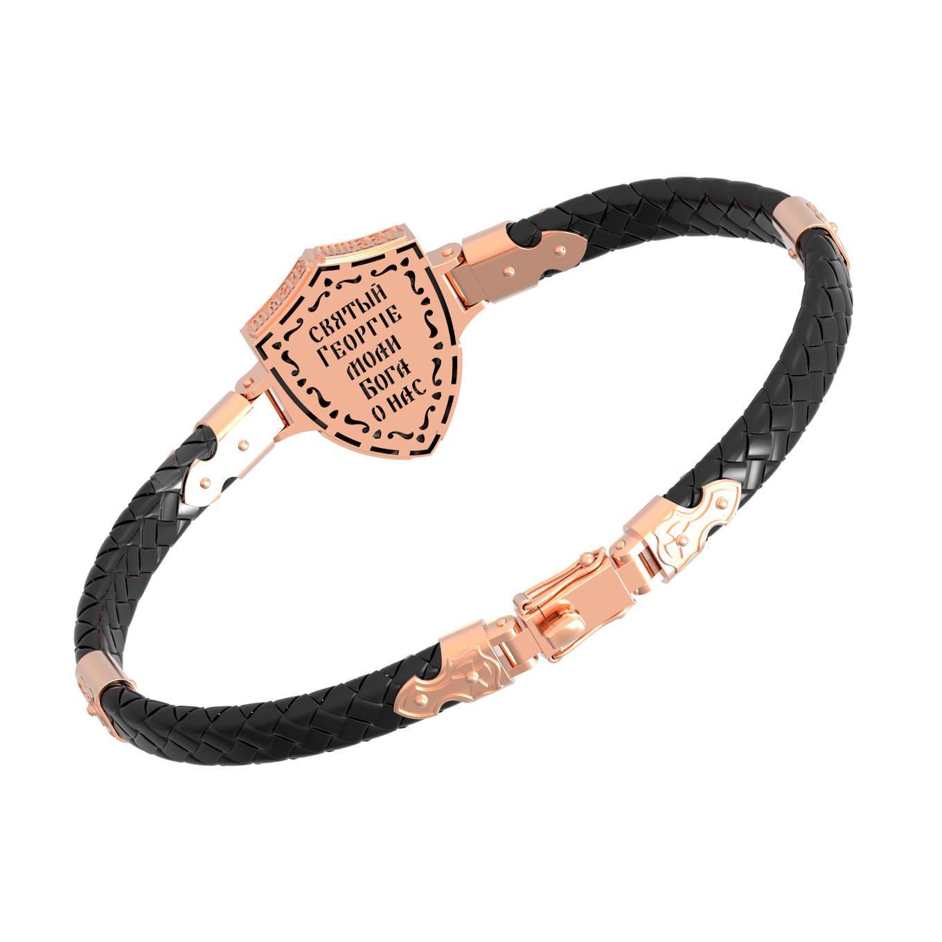 Основой композиции лицевой стороны браслета является изображение Святого Великомученика Георгия Победоносца — одного из самых почитаемых и удивительных святых. Георгий родился в Каппадокии (Малая Азия) в семье богатых и знатных горожан. Юношей поступил на службу к римскому императору Диоклетиану, за отличное знание военного дела и проявленную в боях и походах храбрость был приближен к императору и удостоен высокого воинского звания. Во время начавшихся гонений на христиан, перешел на сторону гонимых и, отвергнув человеческий страх, стал ярым проповедником учения Христа. Мучители подвергли опального воеводу жесточайшим восьмидневным пыткам и казнили его (обезглавили) в возрасте около тридцати лет в 303 году. На Руси он известен как Юрий или Егорий, заступник для верующих, чья жизнь имеет какое-либо отношение к военным делам, помощник в крестьянском труде. Браслет сделан в виде воинского щита. На нем Георгий изображен как воитель, сидящий на вздыбленном коне и поражающий копьем огнедышащего змея. Над образом изображена благословляющая Божия десница. Змей символизирует собою сатанинские силы. Молитвами вознесенными к Всевышнему и своей непреклонной верой он смог одолеть чудовище. Святой убил змея, спас царскую дочь, принесенную в жертву, и жителей города, их души от влияния дьявола, породив в них надежду и веру в Господа, призывая людей принять христианскую веру. На торце изделия помещена молитва: «Господи, помилуй мя грешного».