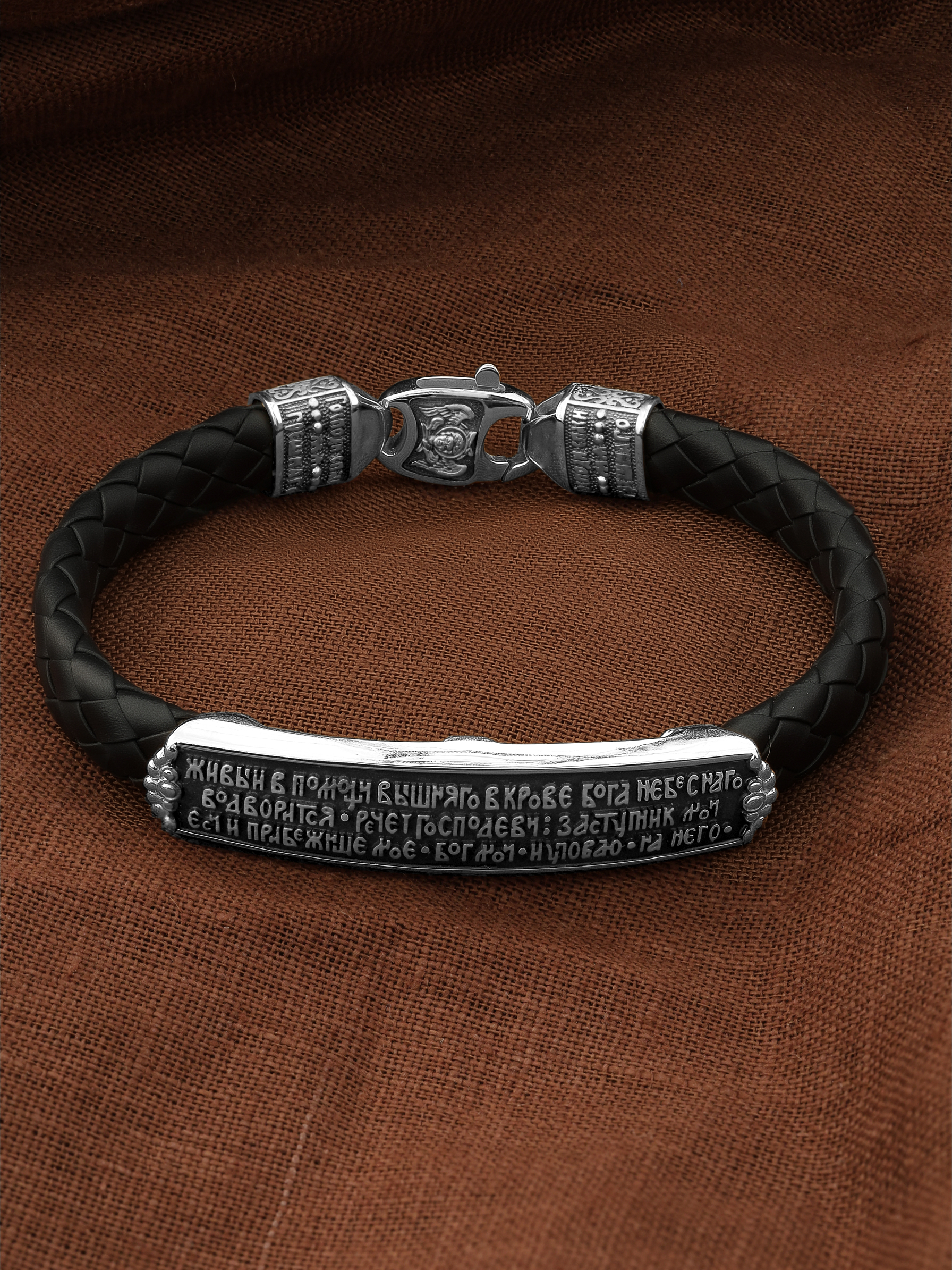 На основном звене браслета написана молитва: «Живый в помощи Вышняго, в крове Бога Небеснаго водворится. Речет Господеви: Заступник мой еси и Прибежище мое, Бог мой, и уповаю на Него.»