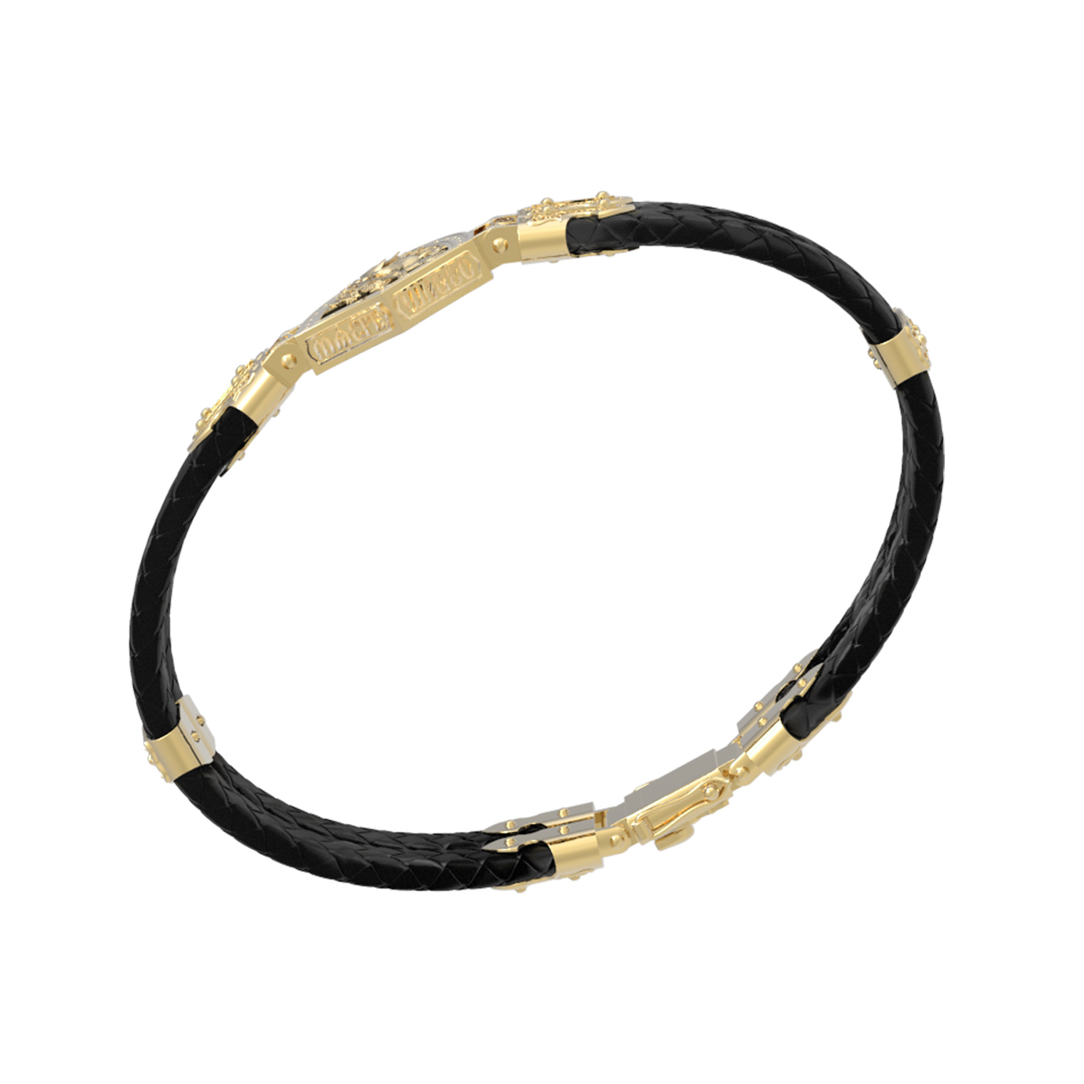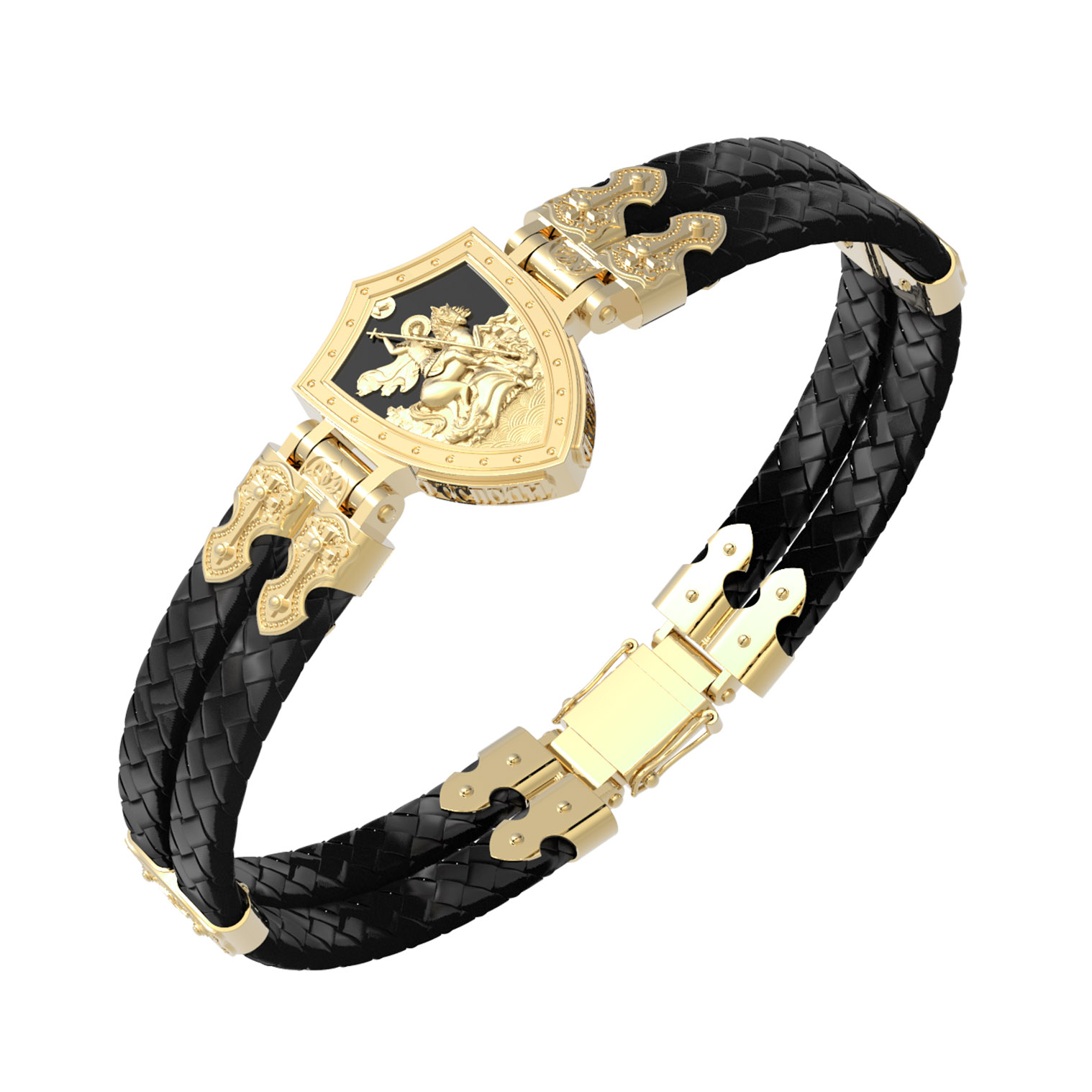 Основой композиции лицевой стороны браслета является изображение Святого Великомученика Георгия Победоносца — одного из самых почитаемых и удивительных святых. Георгий родился в Каппадокии (Малая Азия) в семье богатых и знатных горожан. Юношей поступил на службу к римскому императору Диоклетиану, за отличное знание военного дела и проявленную в боях и походах храбрость был приближен к императору и удостоен высокого воинского звания. Во время начавшихся гонений на христиан, перешел на сторону гонимых и, отвергнув человеческий страх, стал ярым проповедником учения Христа. Мучители подвергли опального воеводу жесточайшим восьмидневным пыткам и казнили его (обезглавили) в возрасте около тридцати лет в 303 году. На Руси он известен как Юрий или Егорий, заступник для верующих, чья жизнь имеет какое-либо отношение к военным делам, помощник в крестьянском труде. Браслет сделан в виде воинского щита. На нем Георгий изображен как воитель, сидящий на вздыбленном коне и поражающий копьем огнедышащего змея. Над образом изображена благословляющая Божия десница. Змей символизирует собою сатанинские силы. Молитвами вознесенными к Всевышнему и своей непреклонной верой он смог одолеть чудовище. Святой убил змея, спас царскую дочь, принесенную в жертву, и жителей города, их души от влияния дьявола, породив в них надежду и веру в Господа, призывая людей принять христианскую веру. На торце изделия помещена молитва: «Господи, помилуй мя грешного».