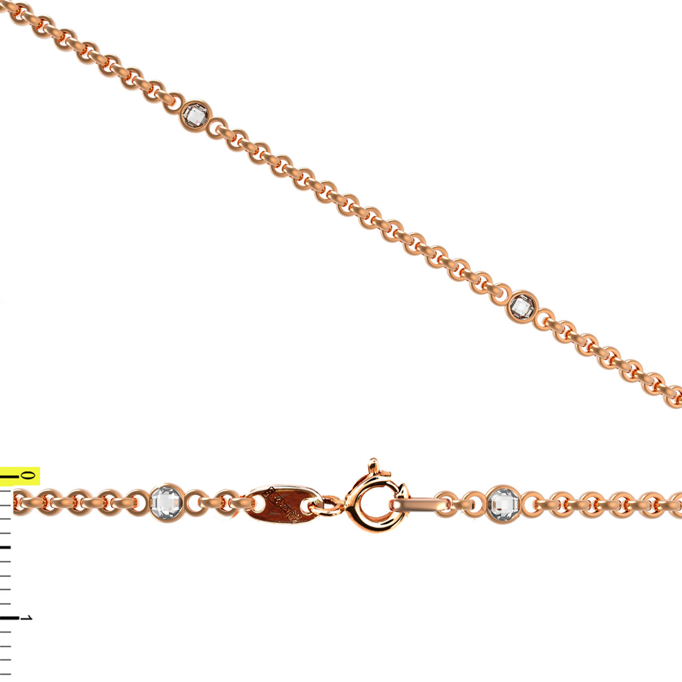 Особую выразительность данной модели придает инкрустация фианитами, которые эффектно сияют при каждом движении, создавая мягкие блики на поверхности металла. Красное золото обладает теплым, благородным оттенком, который гармонично подчеркивает естественную красоту кожи. Качественное плетение звеньев обеспечивает долговечность и комфорт при носке, позволяя изделию красиво лежать в зоне декольте или на запястье, если вы выберете соответствующий вариант исполнения.