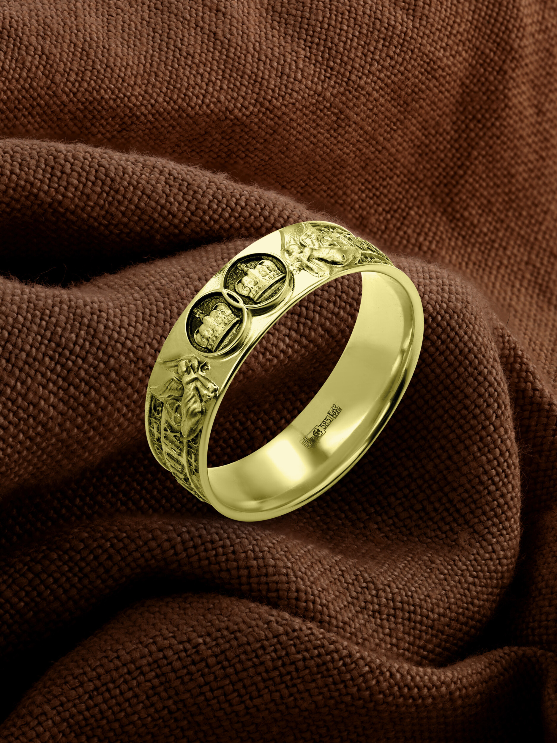На лицевой стороне между Херувимов в кругах, символизирующих обручальные кольца, изображены венчальные венцы, и по кольцу написана молитва «Господи Боже Наш славою и честью венчай их»
